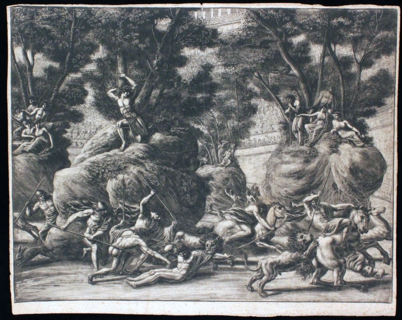 Acquatinta e acquaforte, 623 x 477 mm. Bella impressione su carta vergata. Foglio rifilato ma con sottilissimi margini. Tracce di piega verticale e di piega orizzontale, fioritura sparsa, ma nel generale in buono stato.