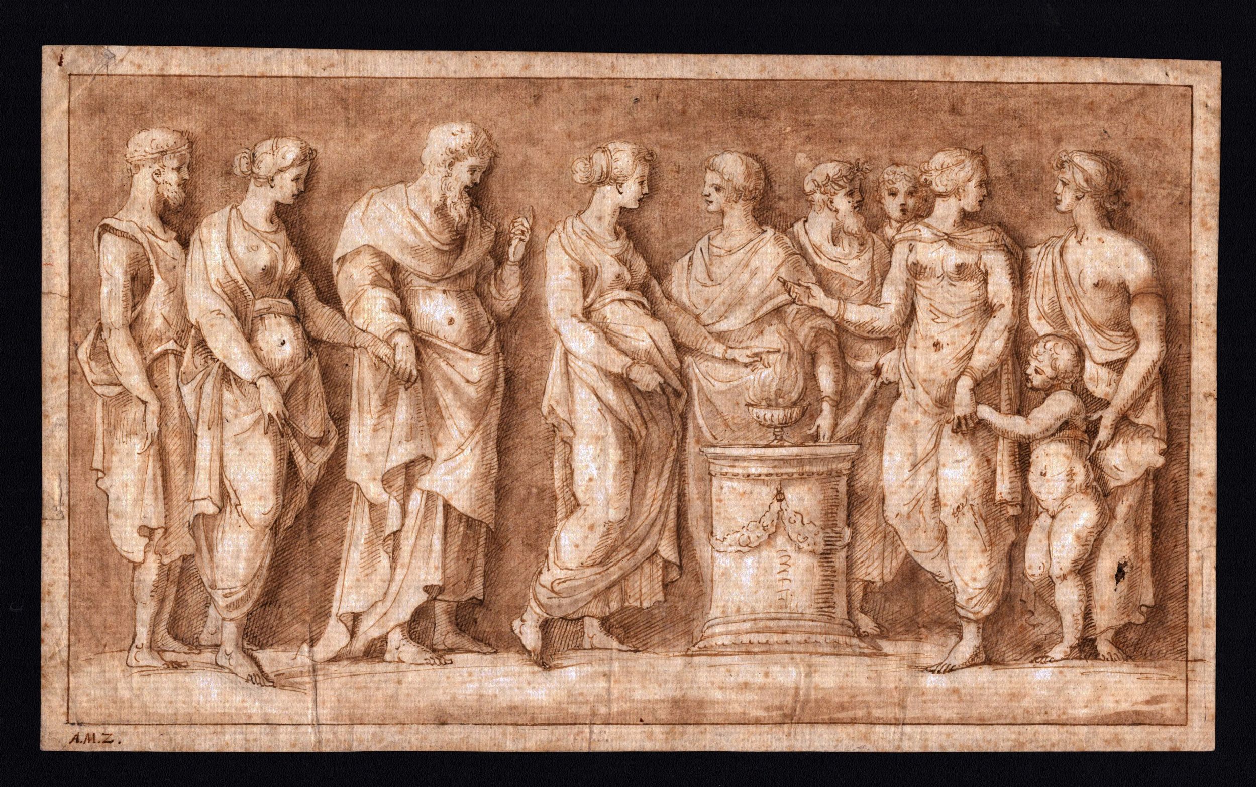 Artista italiano del XIX secolo Inchiostro, penna e acquarello su carta vergata cotrofondata, 180 x 302 mm. Monogramma A.M.Z. in basso a sinistra.