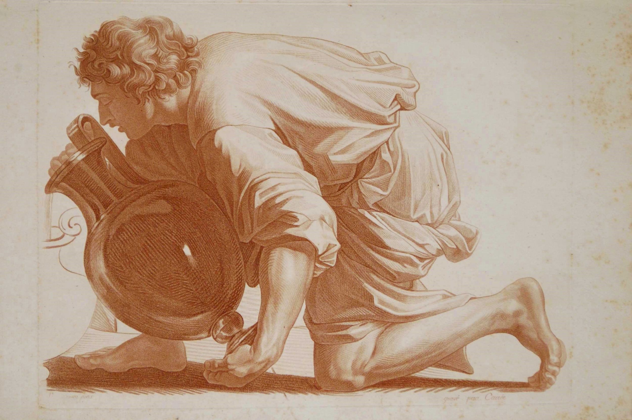 Lotto di due incisioni da Nicolas Poussin. Maniere de crayon, 345 x 525 mm ca. (cad. foglio). Tavole tratte dalla serie 'Recueil de Têtes et de Figures choisies dans les plus beaux tableaux de Nicolas Poussin' pubblicata a Parigi nel 1806. Belle impressioni stampate in rosso su carta vergata ( Uomo che raccoglie acqua con una brocca con filigrana letterale). Esemplari con margini di diverse dimensioni. In generale, in buono stato di conservazione, salvo segni di fioritura e alcune macchie sui bordi.