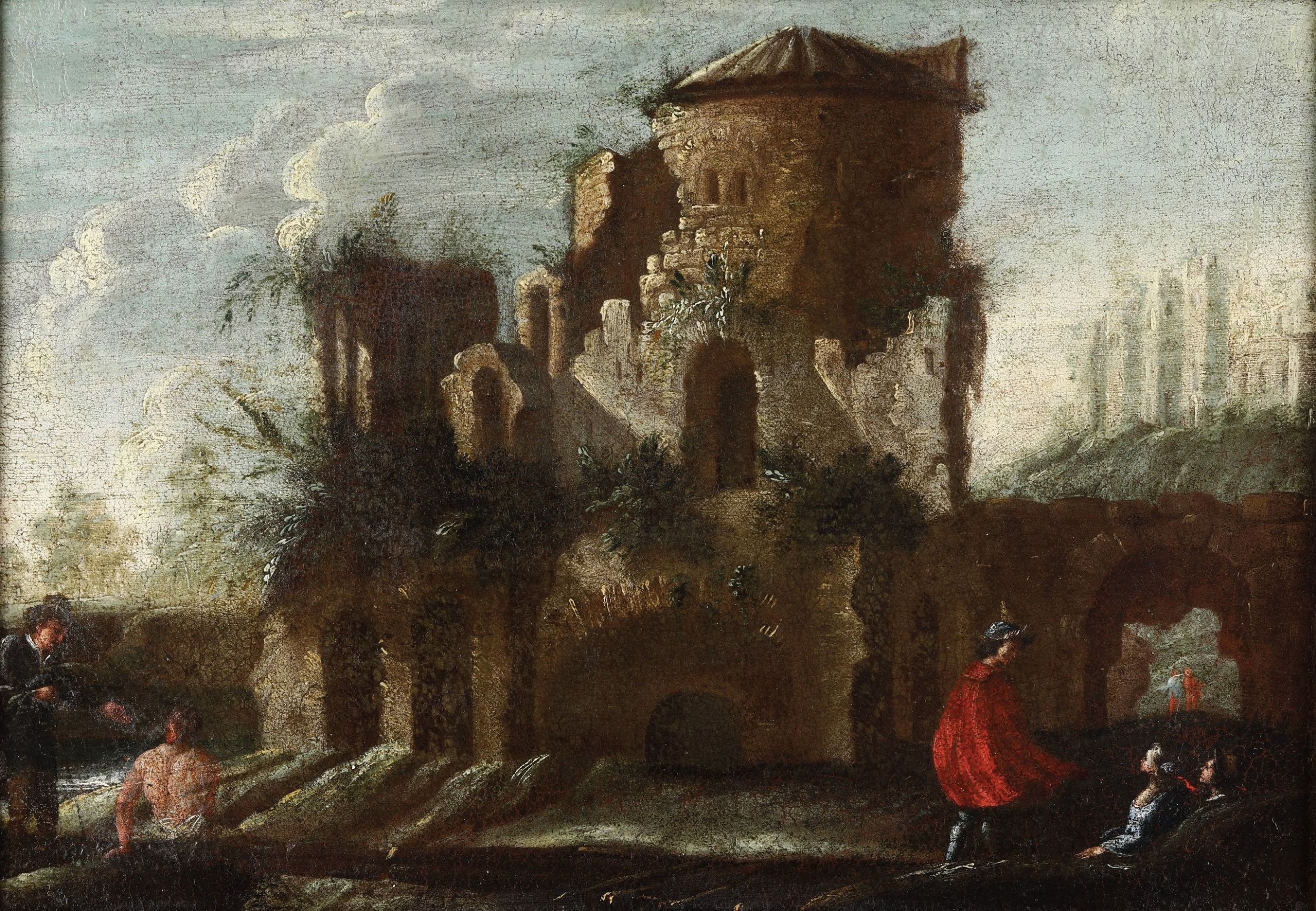 Scuola del XVII secolo Paesaggio con architetture e figure