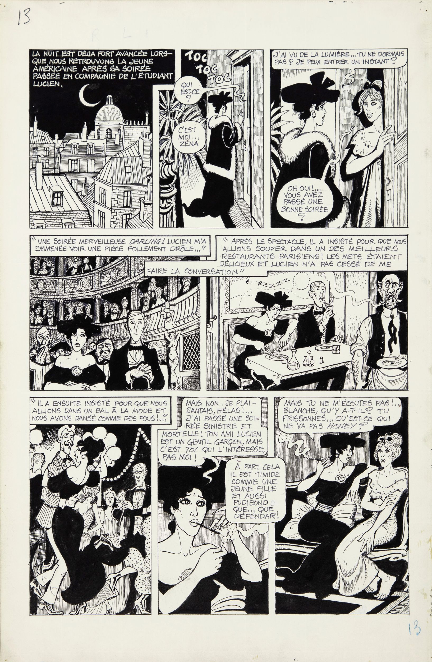 1980 Tavola originale realizzata da Pichard per 'Blanche à New York', pubblicata a pag. 13 del quarto capitolo della saga di 'Blanche Épiphanie' dalla casa editrice francese Les Humanoïdes Associés nel 1980. Creata da Pichard e Lob tra il 1972 e il 1987, le tribolazioni di Blanche Épiphanie sono tra le avventure più incredibili nel pantheon dei fumetti per adulti. La giovane e formosa Blanche viaggia per il mondo suo malgrado, cercando di proteggere la sua virtù. Tormentata dal perfido banchiere Adolfo e da una miriade di altri cattivi, invidiata da Morena, salvata dal ciclista Défendar, eroe mascherato e incappucciato ma di una goffaggine smisurata, la ritroviamo tra Africa e America nella Belle Époque.