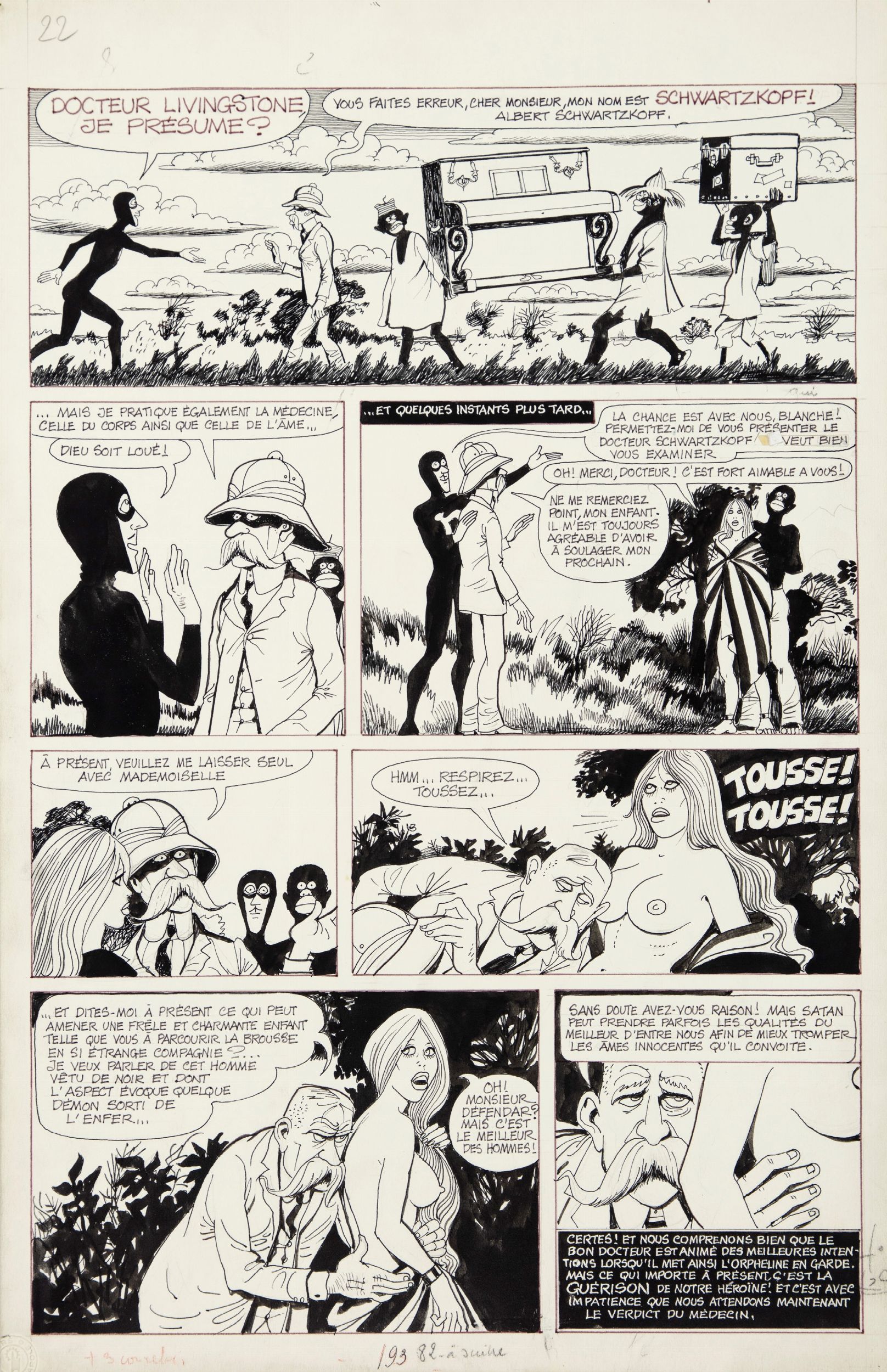 1976 Tavola originale realizzata da Pichard per 'Blanche Épiphanie', pubblicata a pag. 22 del secondo capitolo della saga omonima da Les Éditions du Fromage nel 1976. Creata da Pichard e Lob tra il 1972 e il 1987, le tribolazioni di Blanche Épiphanie sono tra le avventure più incredibili nel pantheon dei fumetti per adulti. La giovane e formosa Blanche viaggia per il mondo suo malgrado, cercando di proteggere la sua virtù. Tormentata dal perfido banchiere Adolfo e da una miriade di altri cattivi, invidiata da Morena, salvata dal ciclista Défendar, eroe mascherato e incappucciato ma di una goffaggine smisurata, la ritroviamo tra Africa e America nella Belle Époque.