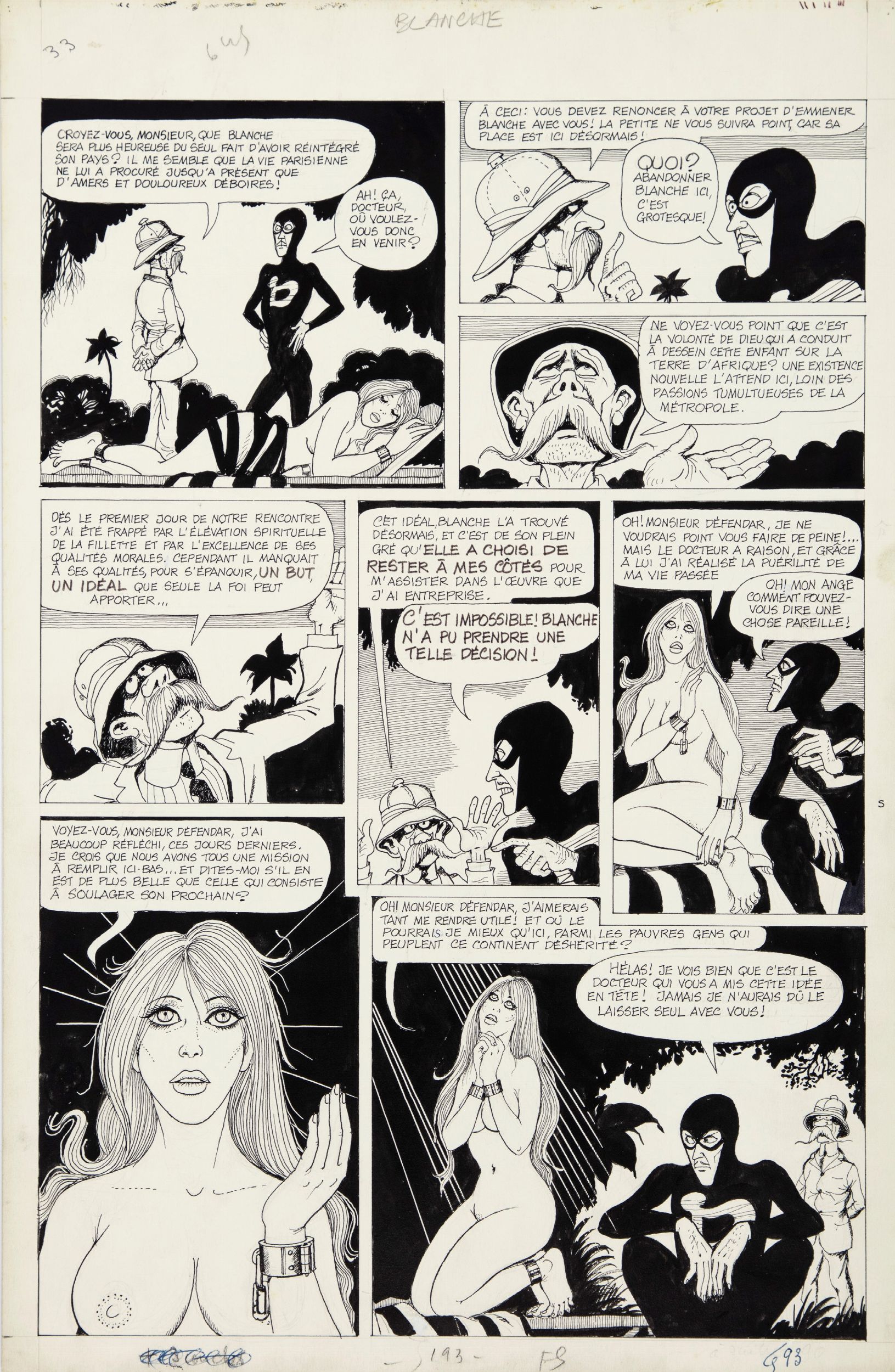 1976 Tavola originale realizzata da Pichard per 'Blanche Épiphanie', pubblicata a pag. 33 del secondo capitolo della saga omonima da Les Éditions du Fromage nel 1976. Creata da Pichard e Lob tra il 1972 e il 1987, le tribolazioni di Blanche Épiphanie sono tra le avventure più incredibili nel pantheon dei fumetti per adulti. La giovane e formosa Blanche viaggia per il mondo suo malgrado, cercando di proteggere la sua virtù. Tormentata dal perfido banchiere Adolfo e da una miriade di altri cattivi, invidiata da Morena, salvata dal ciclista Défendar, eroe mascherato e incappucciato ma di una goffaggine smisurata, la ritroviamo tra Africa e America nella Belle Époque.