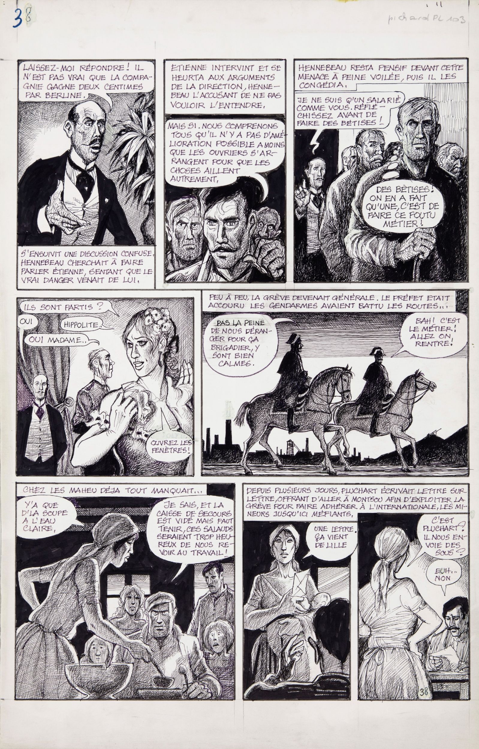 matita e china su cartone, 32,5 x 50 cm 1992 Tavola originale realizzata da Pichard per 'Germinal', pubblicata a pag. 38 dalla casa editrice francese Magic Strip nel 1992. Adattamento in chiave erotica del celebre romanzo 'Germinale' di Émile Zola, al quale Pichard conferisce con uno stile unico un'atmosfera sulfurea, oscena e drammatica.