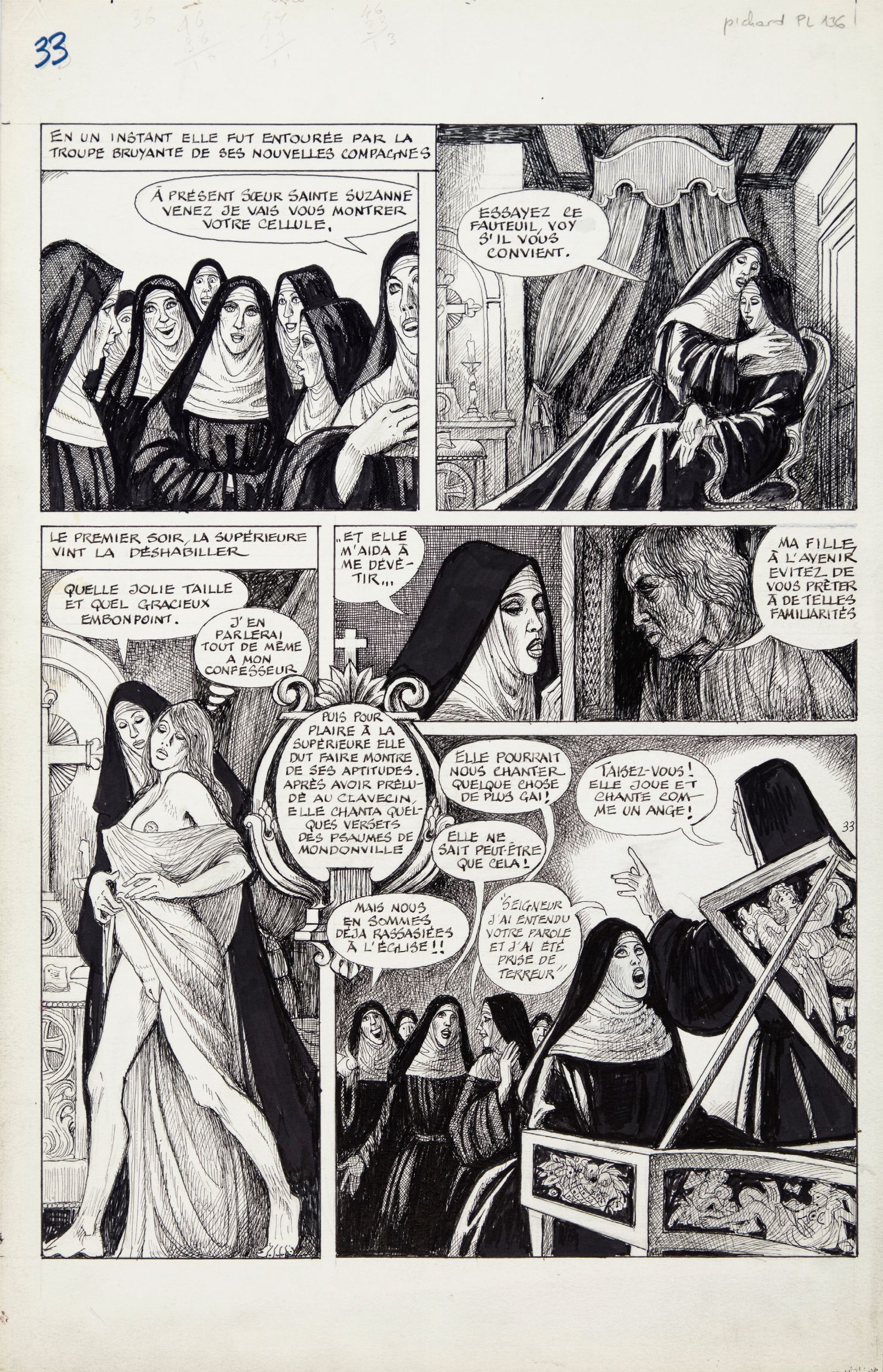 matita e china su cartoncino, 32,5 x 50 cm 1995 Tavola originale realizzata da Pichard per 'La religieuse', edita per la prima volta a pag. 33 dalla casa editrice francese Création Art Presse nel 1995. Tratto dal celebre romanzo 'La monaca' di Denis Diderot è un'opera anticlericale ispirata a un fatto storico riguardante Marguerite Delamarre, una religiosa dell'abbazia di Longchamp, che nel 1758 chiese di uscire dal convento dove la madre l'aveva rinchiusa in quanto la ragazza era figlia di un suo amante.