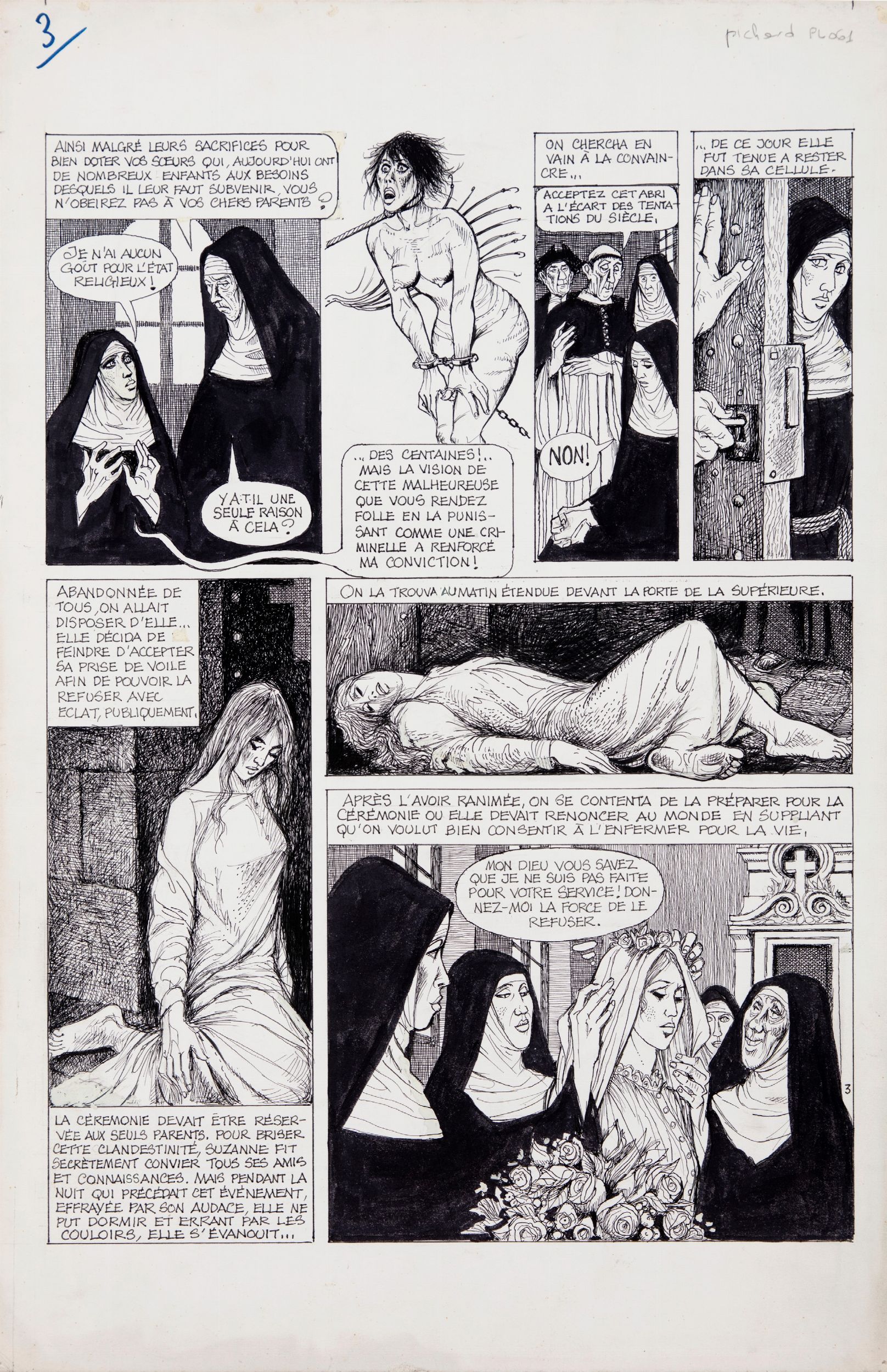 matita e china su cartone, 32,5 x 50 cm 1995 Tavola originale realizzata da Pichard per 'La religieuse', edita per la prima volta a pag. 3 dalla casa editrice francese Création Art Presse nel 1995. Tratto dal celebre romanzo 'La monaca' di Denis Diderot è un'opera anticlericale ispirata a un fatto storico riguardante Marguerite Delamarre, una religiosa dell'abbazia di Longchamp, che nel 1758 chiese di uscire dal convento dove la madre l'aveva rinchiusa in quanto la ragazza era figlia di un suo amante.