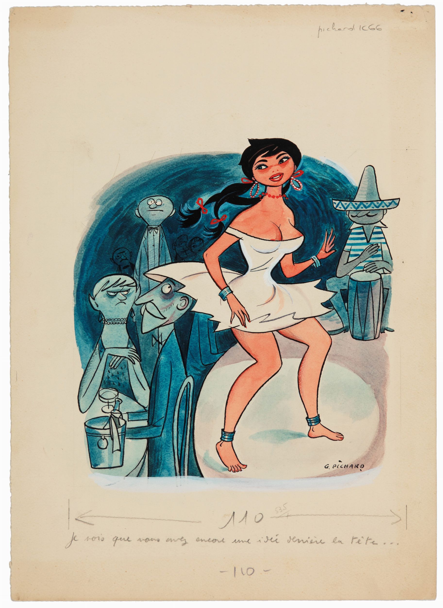 anni 50 Illustrazione originale realizzata da Pichard alla fine degli anni '50 per il giornale satirico francese Le Rire. Lieve piega all'angolo inferiore destro. Firmata.