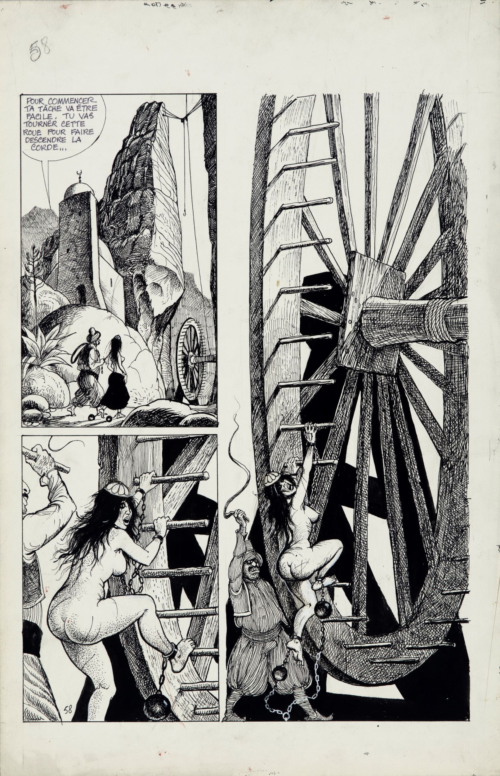matita e china su cartone, 32 x 50 cm 1981 Tavola originale realizzata da Pichard per 'Marie-Gabrielle en Orient', edita per la prima volta a pag. 58 dalla casa editrice francese Glénat nel 1981. La presente opera è stata inserita nel volume 'Les 100 plus belles planches de la BD érotique' riprodotta a pag. 139 dalla casa editrice francese Beaux Arts éditions nel 2015. Lievi pieghe agli angoli.