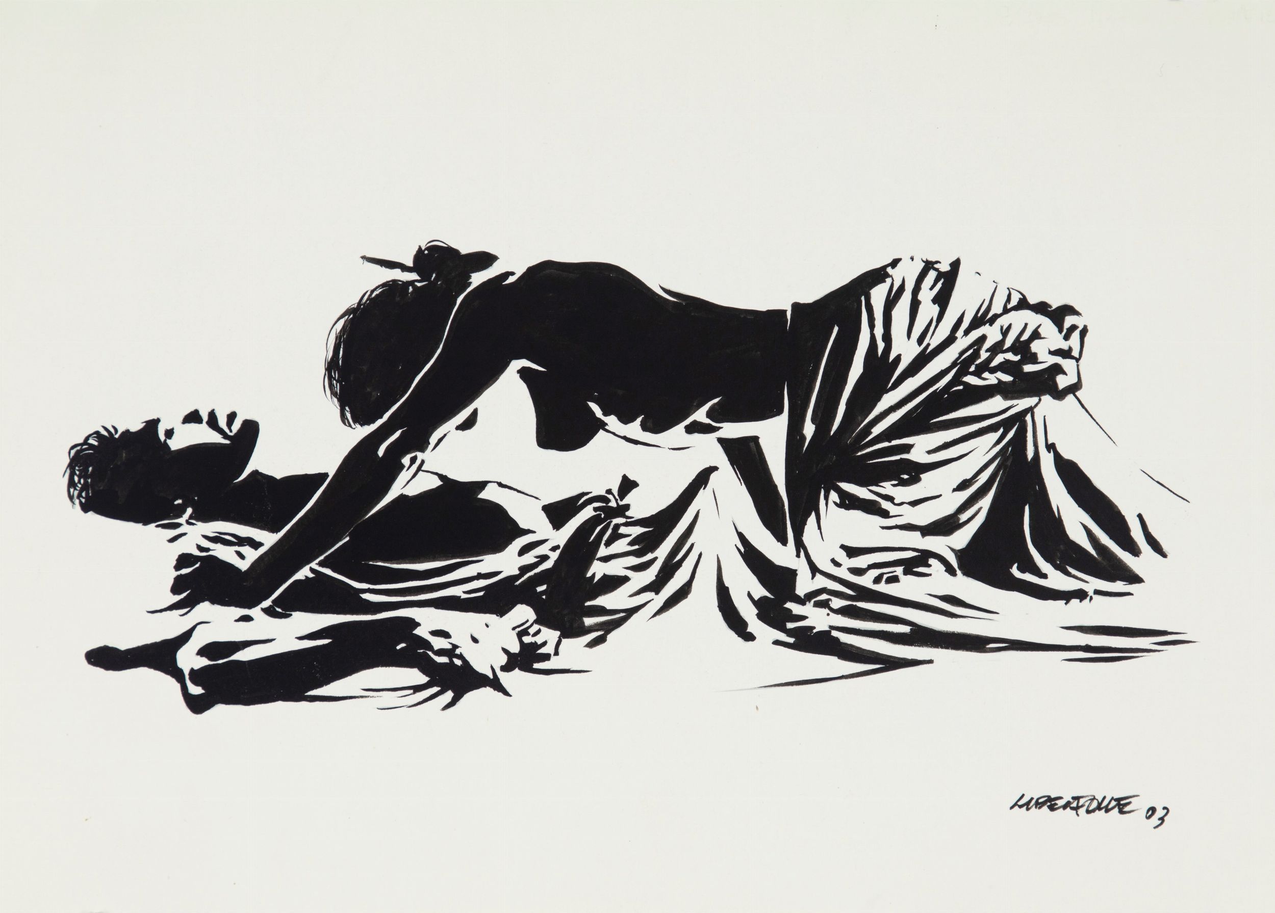 matita e china su cartoncino, 33 x 24 cm 2003 Illustrazione originale realizzata da Liberatore per il portfolio 'B. & W.' edito dalle Edizioni Di nel 2008. Un raffinato erotismo degno di uno dei grandi maestri internazionali dell'eros. Firmata e datata.