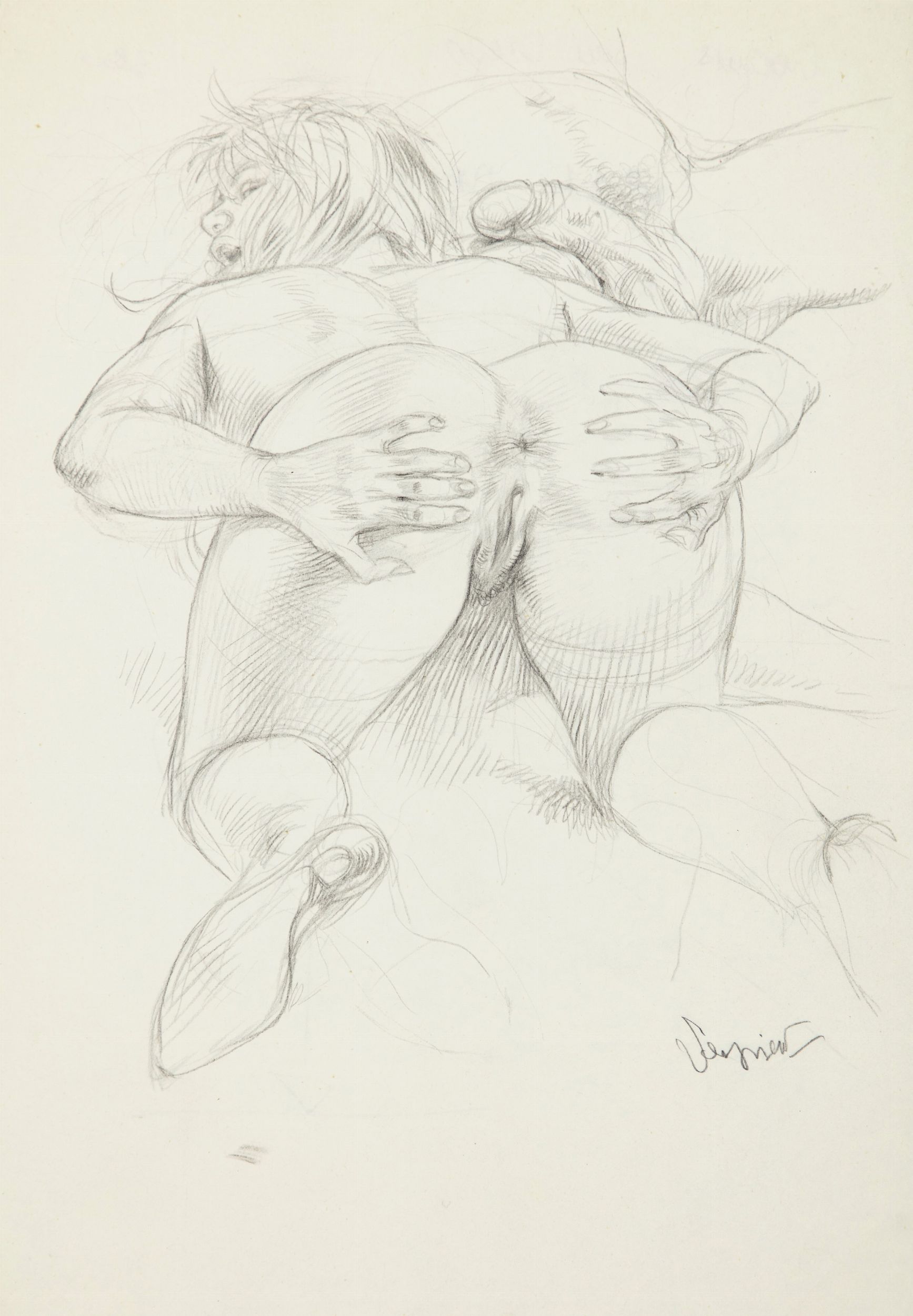 matita su carta, 21,5 x 31 cm 1995 Studio originale realizzato da Serpieri per la sua sexy eroina Druuna, pubblicato sul volume 'Serpieri Sketchbook' da Heavy Metal nel 1995. Con pochi tratti di matita Serpieri riesce a dare vita a un'idea, portandoci in una dimensione di puro erotismo e sensualità. Firmato.