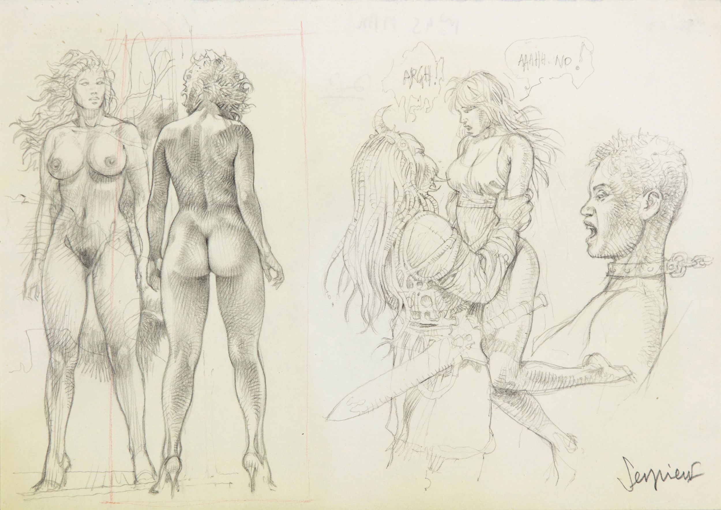 matita su carta, 29,5 x 21 cm anni 90 Studio originale realizzato da Serpieri per la sua sexy eroina Druuna durante gli anni '90. Con pochi tratti di matita Serpieri riesce a dare vita a un'idea, portandoci in una dimensione di puro erotismo e sensualità. Firmato.