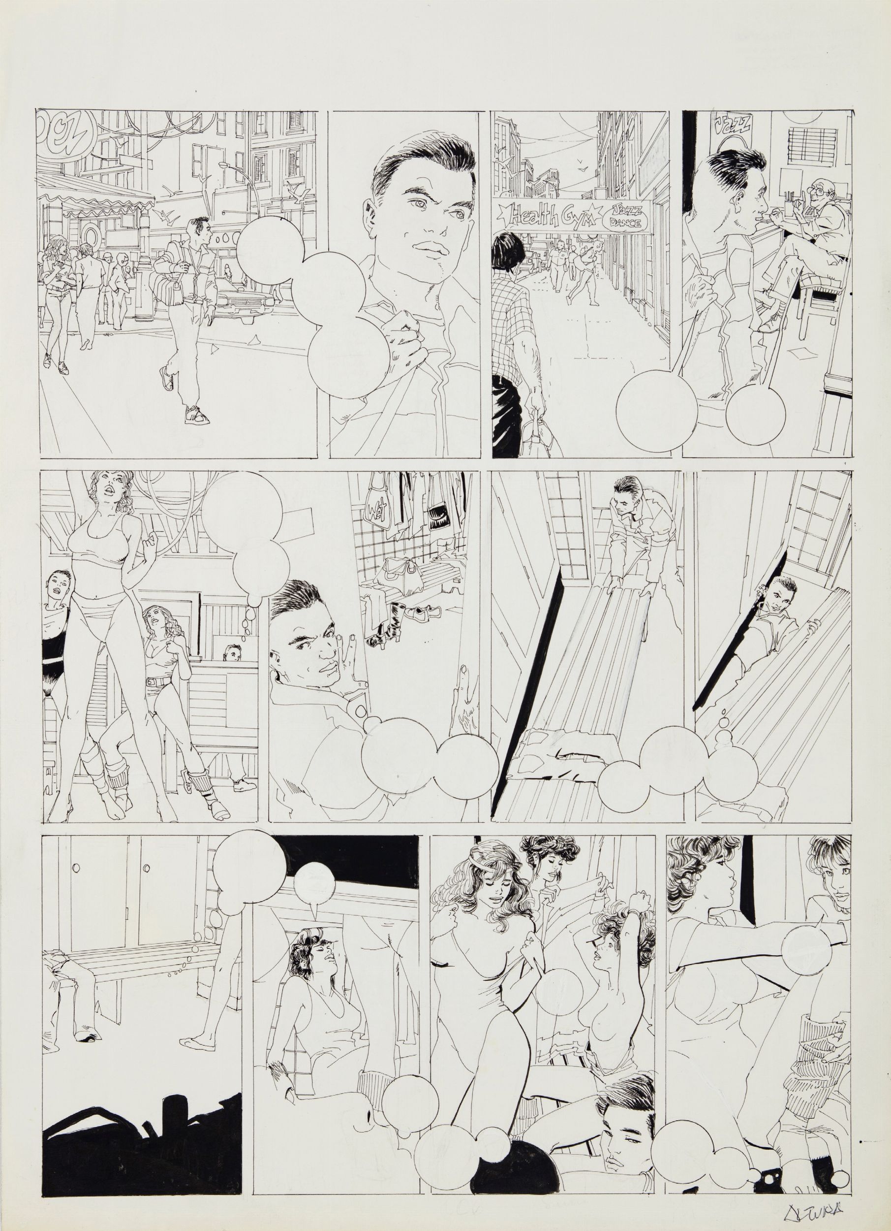 matita e china su cartoncino, 32,5 x 45 cm anni 80 Tavola originale realizzata da Altuna per la pag. 1 della avventura erotica intitolata 'En forma', pubblicata per la prima volta sulle pagine di Playboy negli anni '80 e successivamente ristampata nel volume 'El Mirón 2' dalle Ediciones de la Urraca nel 1996. Lieve piega all'angolo superiore sinistro. Firmata al fronte e recante il timbro dell'artista al retro.