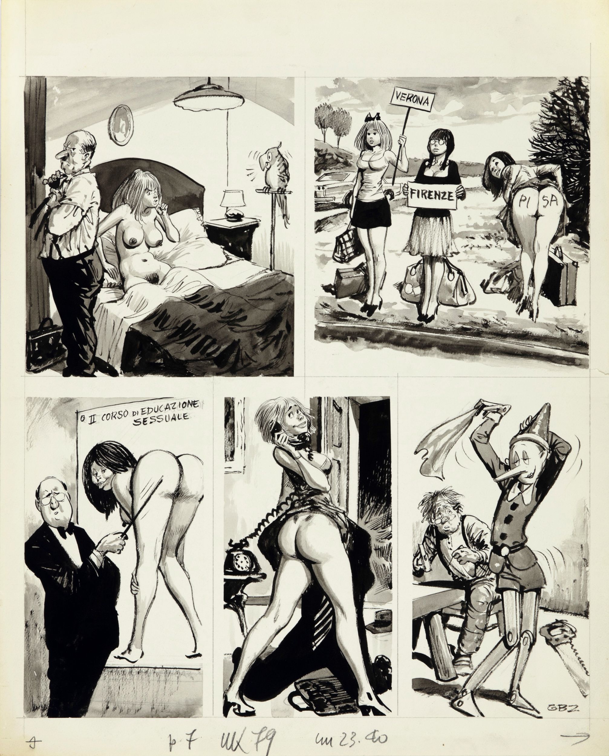 1973 Tavola originale realizzata da Buzzelli per il settimanale eroticomico Menelik n. 79 del 1973. Piccolo strappo al margine destro. Firmata.