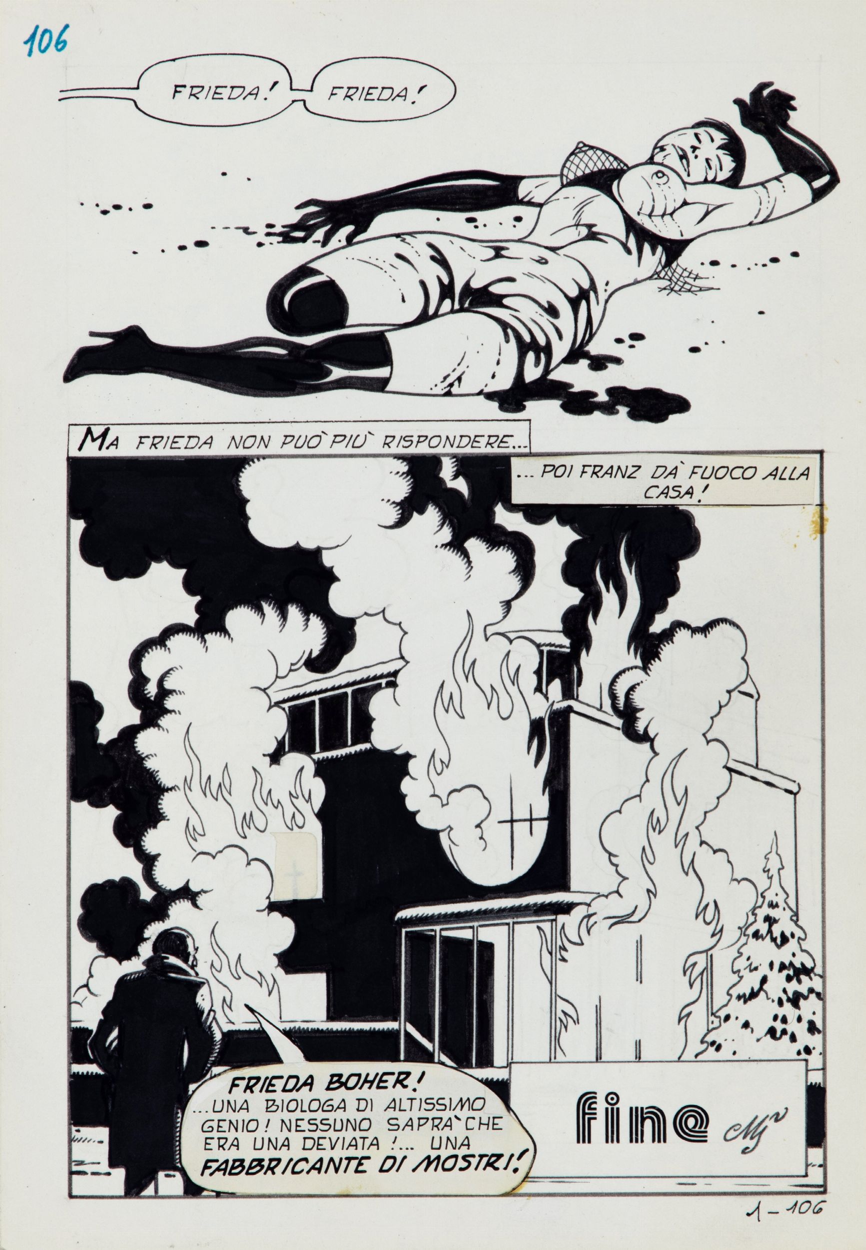 matita e china su cartoncino, 17,5 x 25 cm 1981 Tavola originale realizzata da Magnus per 'La fabbricante di mostri', edita su Necron n. 1 a pag. 106 dalla Edifumetto nel 1981. La pagina finale del primo capitolo di quello che diverrà un vero e proprio cult nella produzione del maestro bolognese. Firmata.
