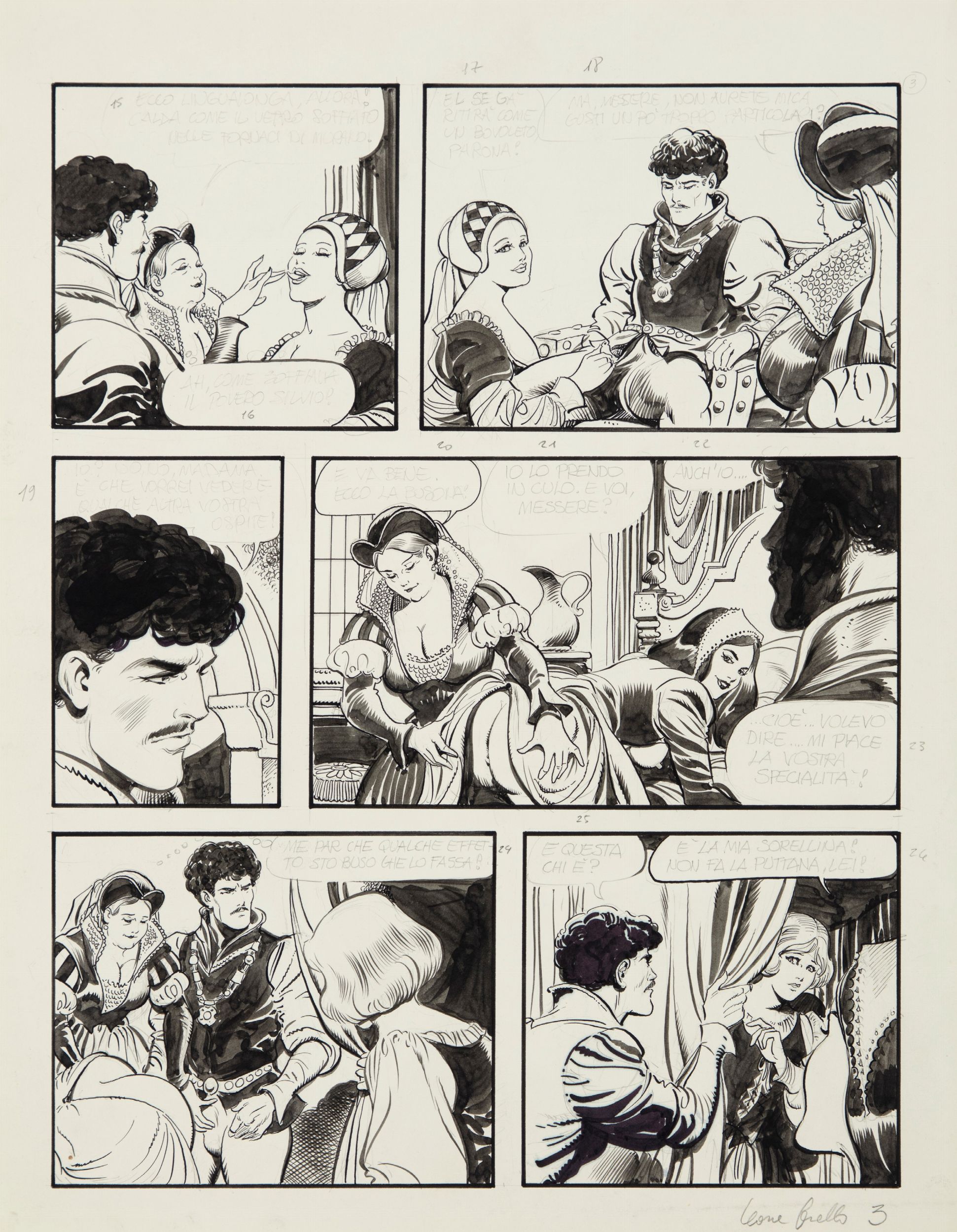 matita e china su cartoncino, 30 x 38 cm 1987 Tavola originale realizzata da Frollo per 'Per chi suona la Carampana', avventura erotica ambientata nella zona di Venezia dove nel Cinquecento c'erano i bordelli (da qui il calambour del titolo), edita a pag. 3 nel volume Diva Puttana dalla Glittering Images nel 1987. Firmata.