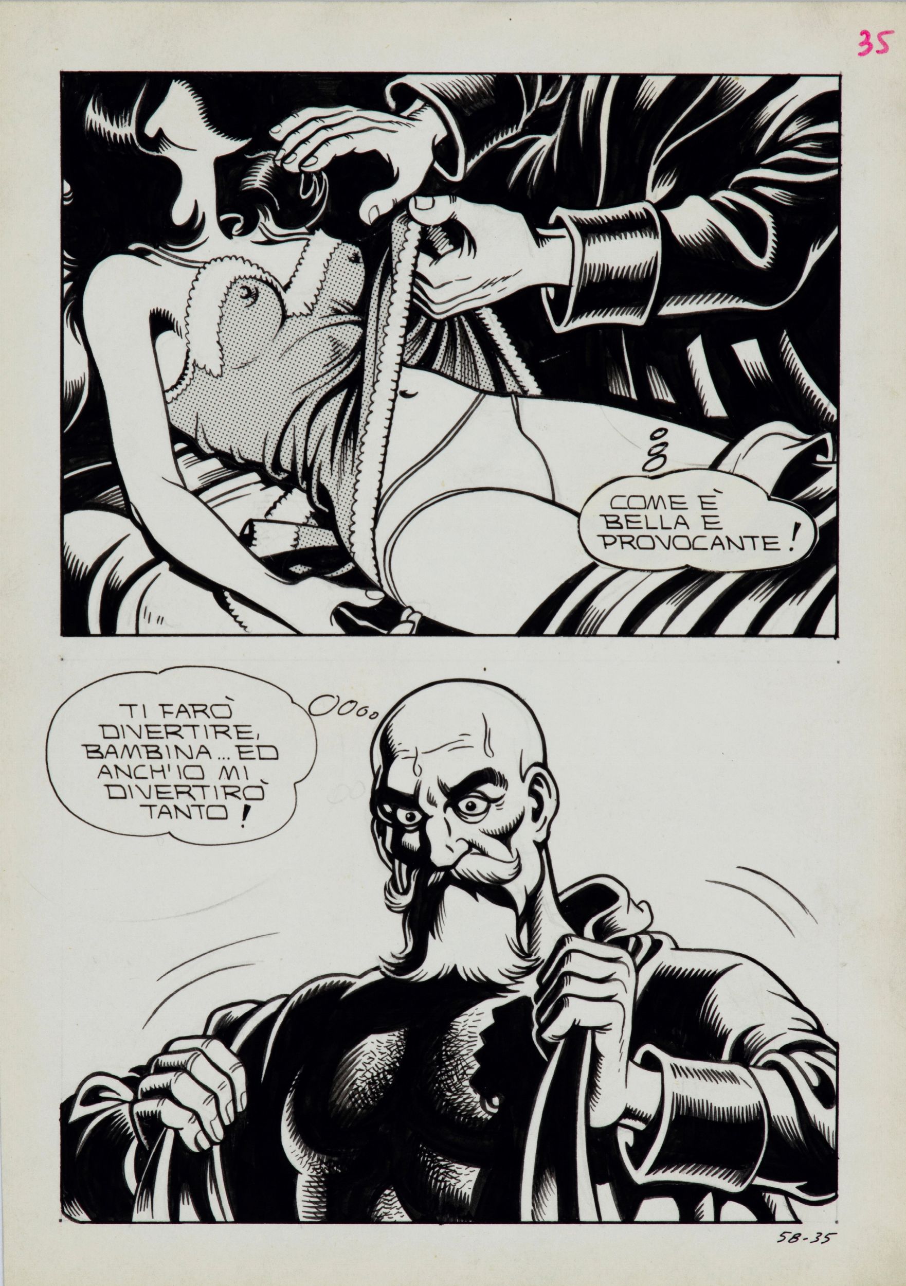 matita, china e retino su cartoncino, 17,5 x 25 cm 1975 Tavola originale realizzata da Magnus per 'Quella sera al collegio femminile', edita su Il Vampiro Presenta n. 3 a pag. 35 dalla Edifumetto nel 1975. Appartenente al ciclo delle cosiddette 'novelle erotiche' questa storia, sceneggiata dallo stesso Magnus, segna il primo passo dal maestro bolognese nel mondo del fumetto erotico. Di grande rarità.