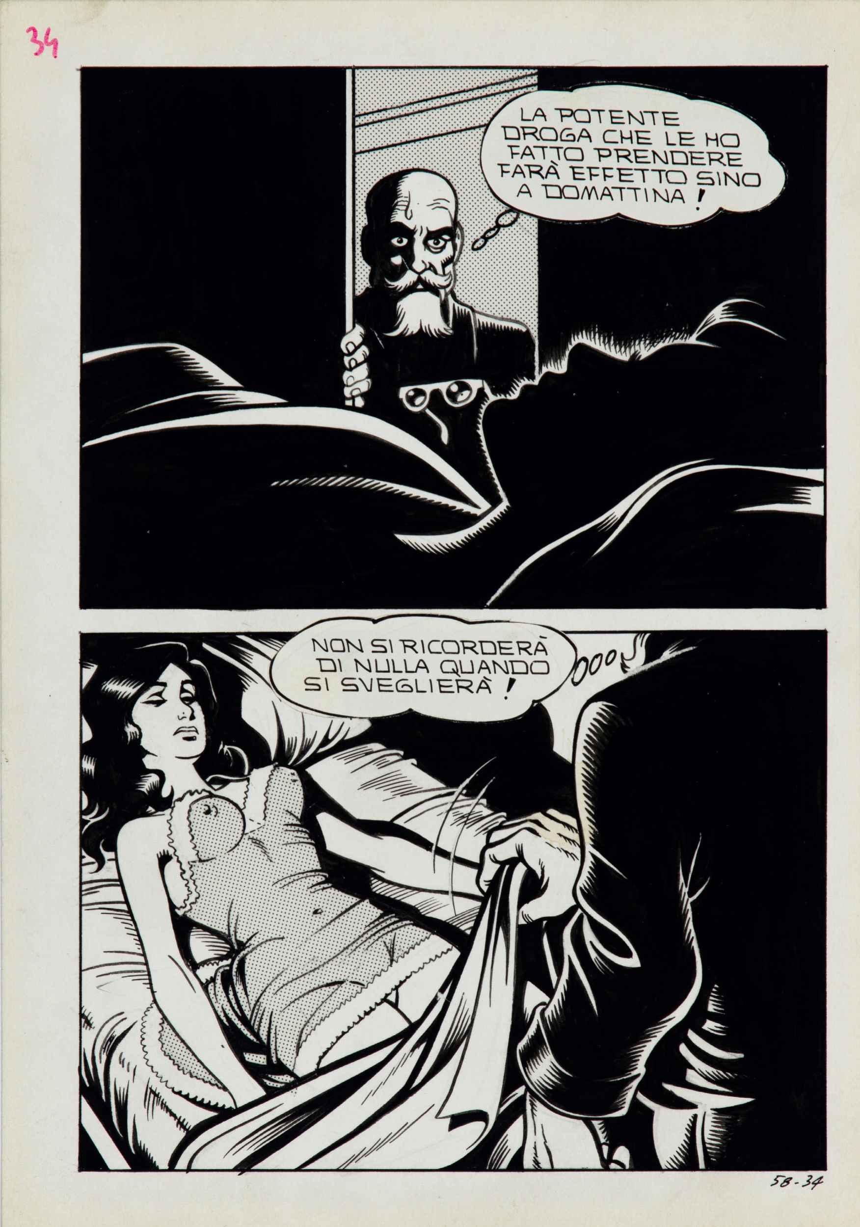 matita, china e retino su cartoncino, 17,5 x 25 cm 1975 Tavola originale realizzata da Magnus per 'Quella sera al collegio femminile', edita su Il Vampiro Presenta n. 3 a pag. 34 dalla Edifumetto nel 1975. Appartenente al ciclo delle cosiddette 'novelle erotiche' questa storia, sceneggiata dallo stesso Magnus, segna il primo passo dal maestro bolognese nel mondo del fumetto erotico. Di grande rarità.
