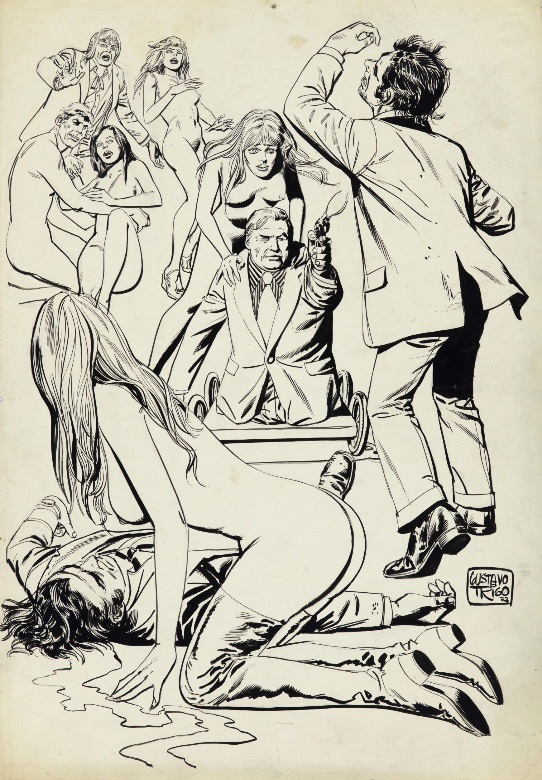 1972 Tavola originale realizzata da Trigo nel 1972. Piega orizzontale al centro, foro di affissione al margine superiore e piccola mancanza al margine sinistro. Firmata e datata.