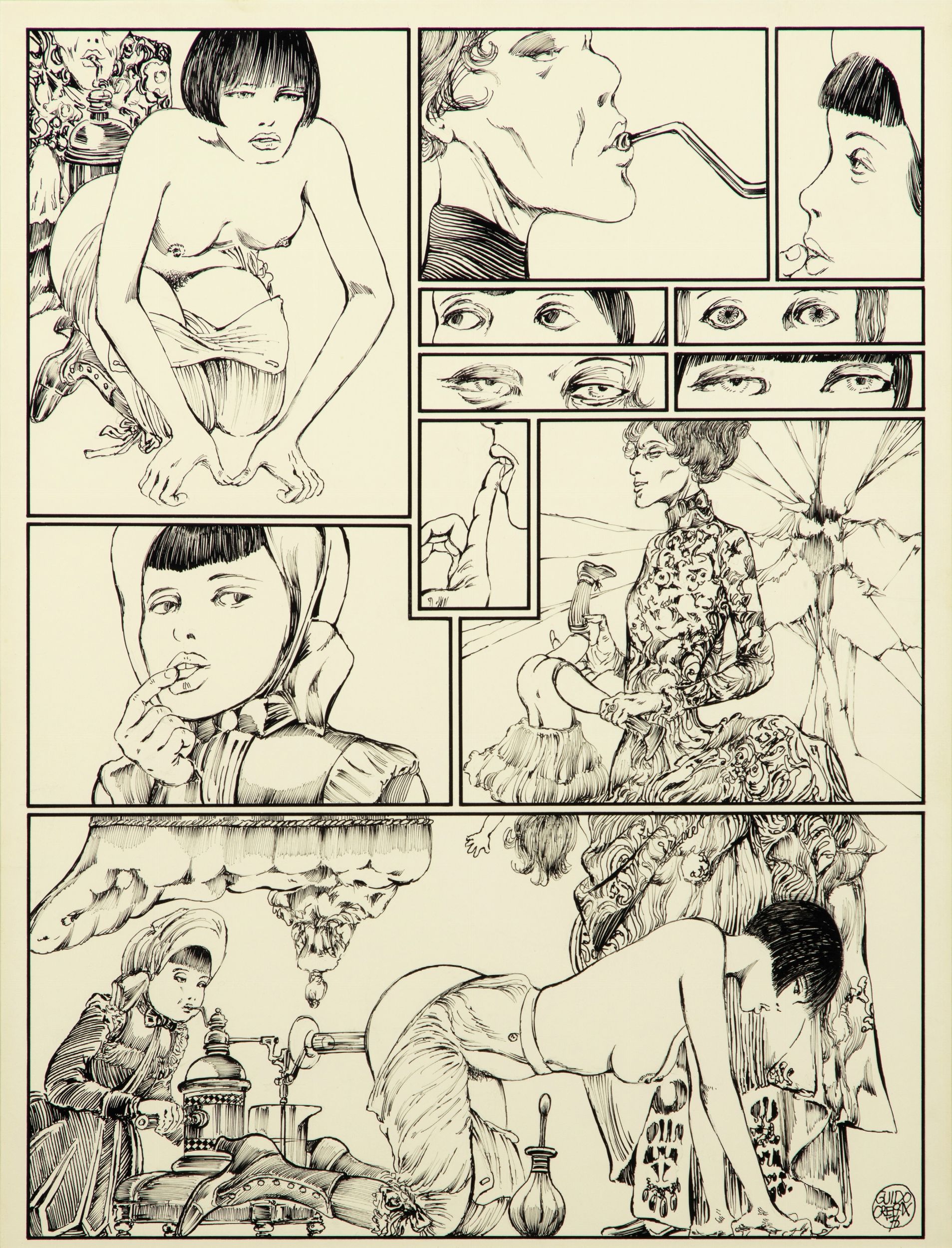 matita e china su cartone, 36,5 x 48,5 cm 1976 Tavola originale realizzata da Crepax per la pag. 32 di 'Lanterna magica', avventura della sensuale Valentina edita per la prima volta dalla Editiemme nel 1979. Unico racconto a fumetti di Crepax senza parole 'Lanterna magica' è da considerarsi una delle sue opere più oniriche, Valentina insonne si appisola e si risveglia e, nel suo dormiveglia, flusso di coscienza e sogno si intrecciano in un susseguirsi di visioni passando nei vari mondi che sono stati teatro delle sue avventure. Firmata e datata.