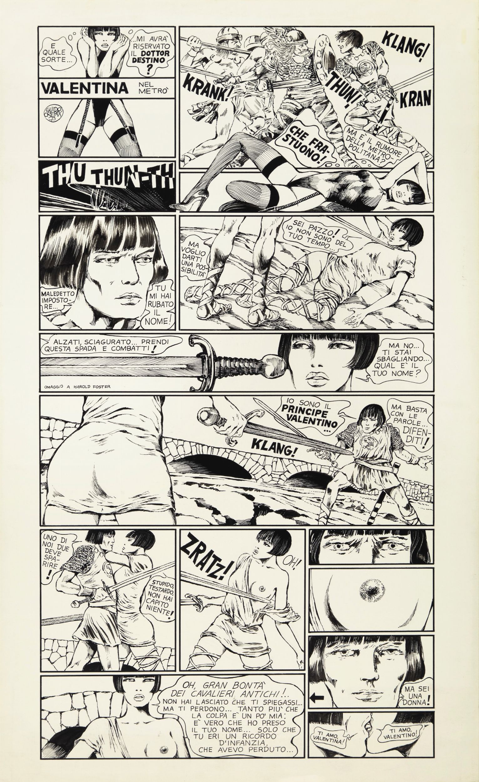 matita e china su cartone, 43 x 70 cm 1975 Tavola originale realizzata da Crepax per 'Valentina nel metṛ', pubblicata a pagg. 49 - 50 per la prima volta sulla rivista Linus nel 1975. Un viaggio nella follia della metropolitana Milanese, una vacanza che accende i ricordi e svela segreti di famiglia, due occasioni per Valentina di incrociare la strada dei grandi personaggi del fumetto, in quello che è un lungo atto d‘amore di Guido Crepax verso la nona arte. Il maestro milanese si rifugia nella fantasia citando apertamente i suoi amori e divertendosi a reinterpretare col suo stile alcune pietre miliari dei comics in una serie di avventure monotavola seguendo lo stile delle tavole domenicali dei fumetti americani in strisce. In questa splendida tavola la Valentina di Crepax incontra il Prince Valiant di Hal Foster. Di grande rarità. Firmata e datata.