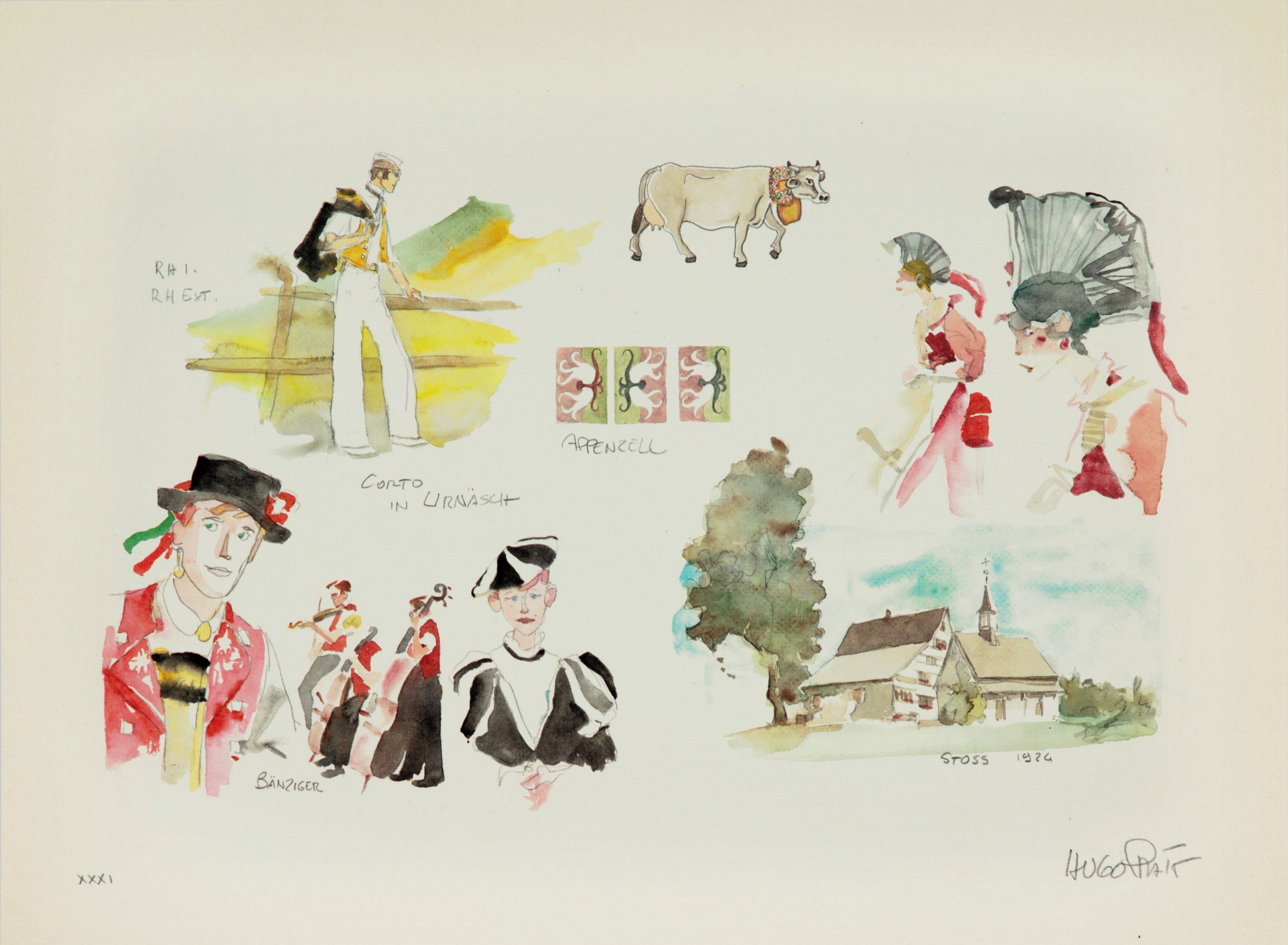 1991 Litografia a colori impressa su cartoncino di pregio Fabriano facente parte del portfolio '...et in Helvetia Corto', edito dalla Cong SA nel 1991. Portfolio realizzato in occasione dei festeggiamenti per i 700 anni della Confederazione Elvetica, tirato in 899 esemplari + 100 editi in cifra romana. Litografia proveniente della tiratura di testa in cifre romane (copia XXXI/C). Firmata a matita personalmente da Pratt e numerata.