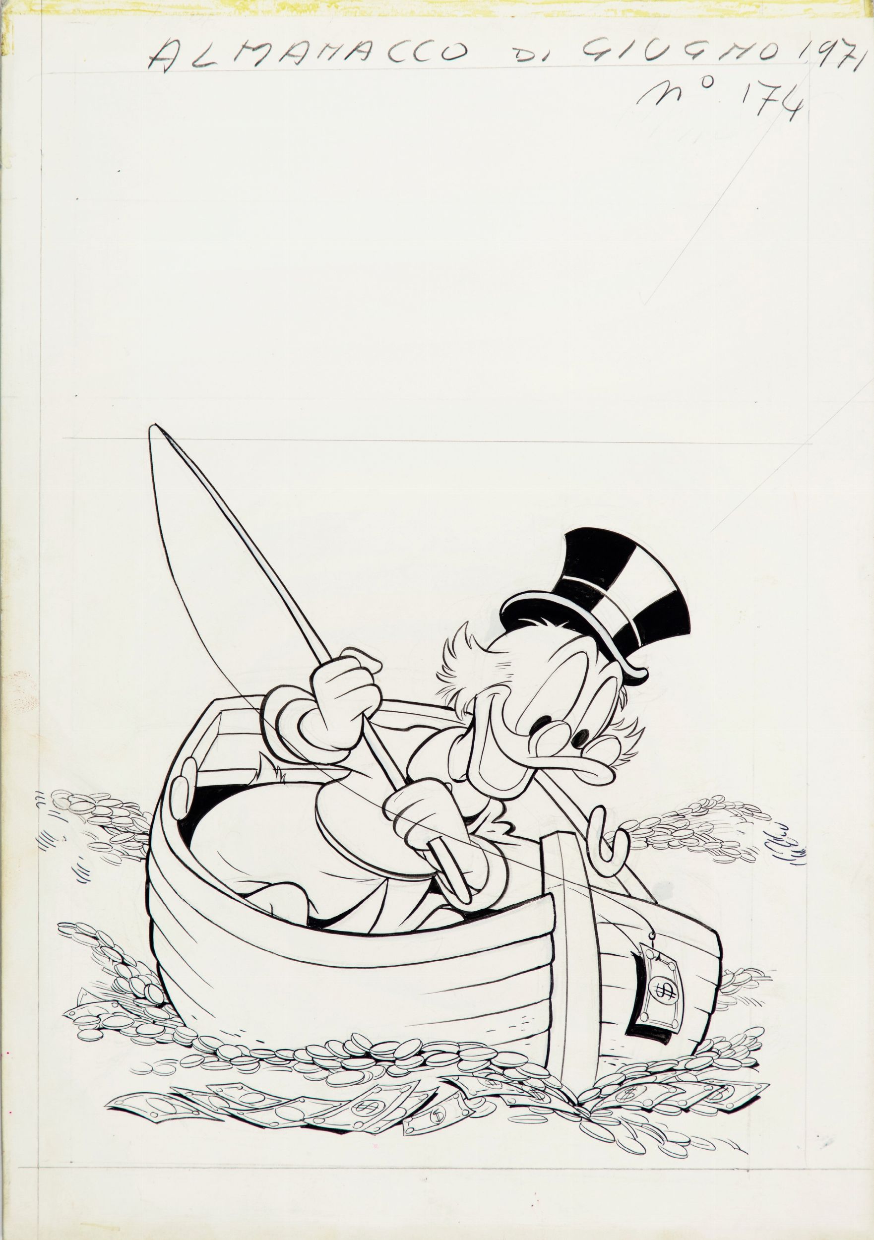 matita e china su cartone, 26 x 36,5 cm 1971 Originale di copertina realizzato da Perego per l'Almanacco Topolino n. 174 del giugno 1971. L'essenza di Zio Paperone condensata in un'unica immagine, tra le più affascinanti copertine della serie. Si allega la prova colore a tempera su carta (25 x 35 cm).
