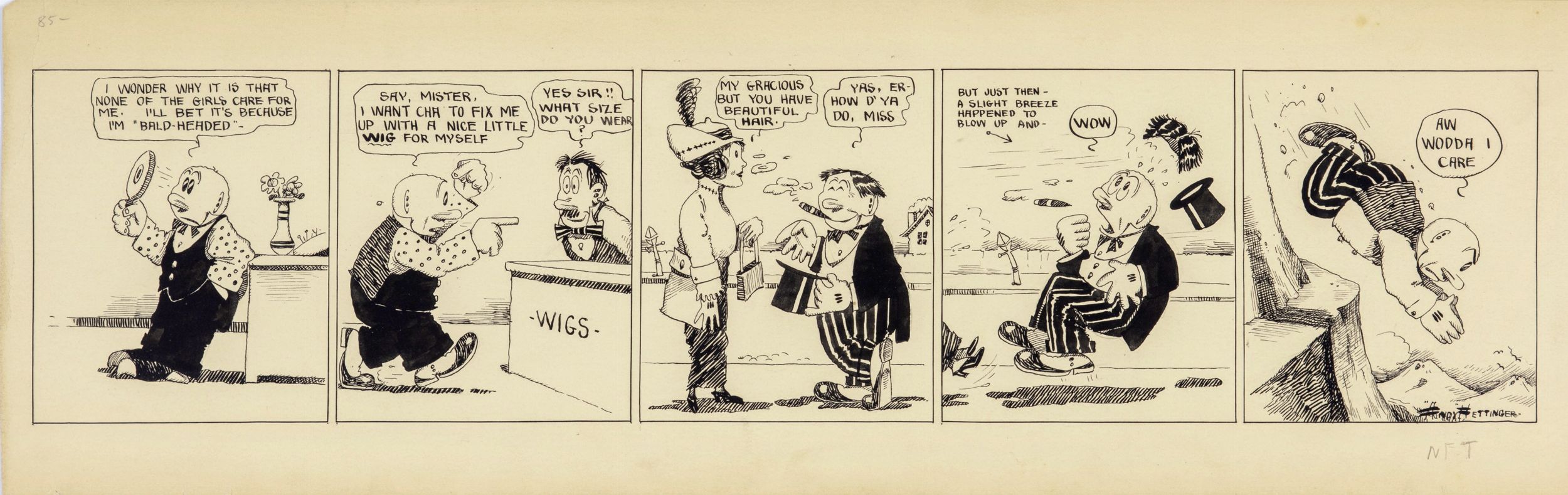 anni 10 Striscia giornaliera degli anni '10 per 'Amos Roach'. Lievi pieghe all'angolo superiore sinistro e due piccoli strappi al margine inferiore. Firmata.
