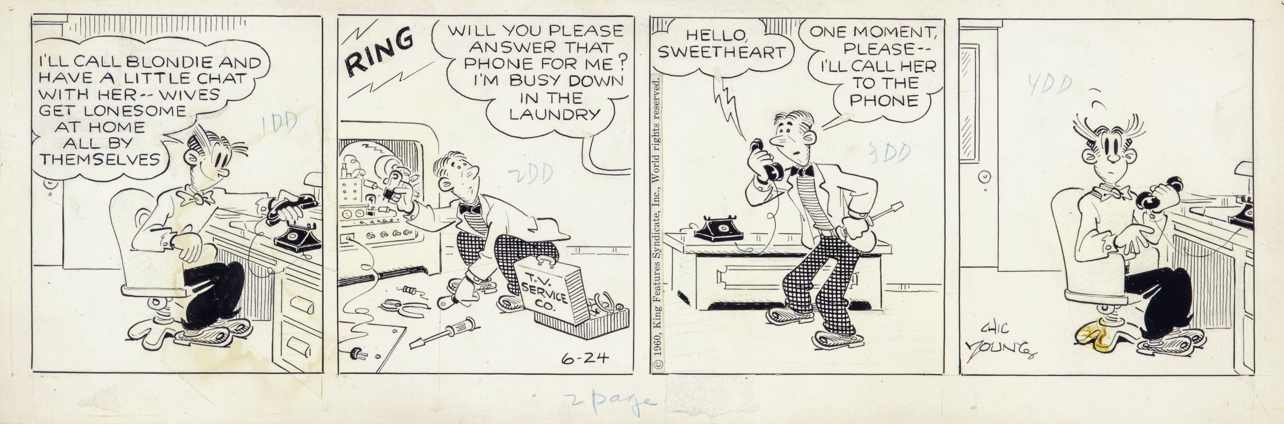 matita e china su cartoncino, 46,5 x 15,5 cm 1960 Striscia giornaliera del 24/06/1960 per 'Blondie'. Prototipo delle moderne sit-com, questa striscia, nata dal genio di Young nel 1930, vede protagonista la tradizionale famiglia americana dei Bumstead. Lieve ondulatura della carta. Firmata e datata.