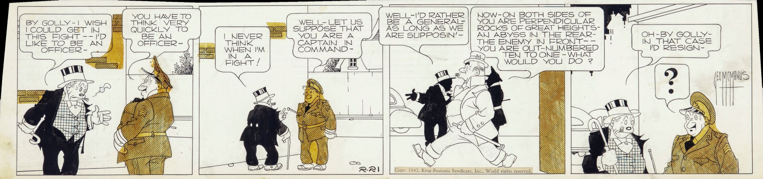 1942 Striscia giornaliera del 21/02/1942 per 'Bringing Up Father'. Creata da George McManus e apparsa per la prima volta il 12 Gennaio 1913, 'Bringing Up Father' narra le vicissitudini dei coniugi Jiggs e Maggie due immigrati irlandesi che improvvisamente, dopo una vita passata l'uno come muratore e l'altra come lavandaia, diventano benestanti grazie a una fortunata vincita alla lotteria, è il grande mito americano, quello del povero che ha l'opportunità di arricchirsi. Elegante, raffinato, caricaturale ma al tempo stesso splendido, lo stile di McManus è ancora oggi uno dei più fulgidi esempi di arte fumettistica. Firmata e datata.