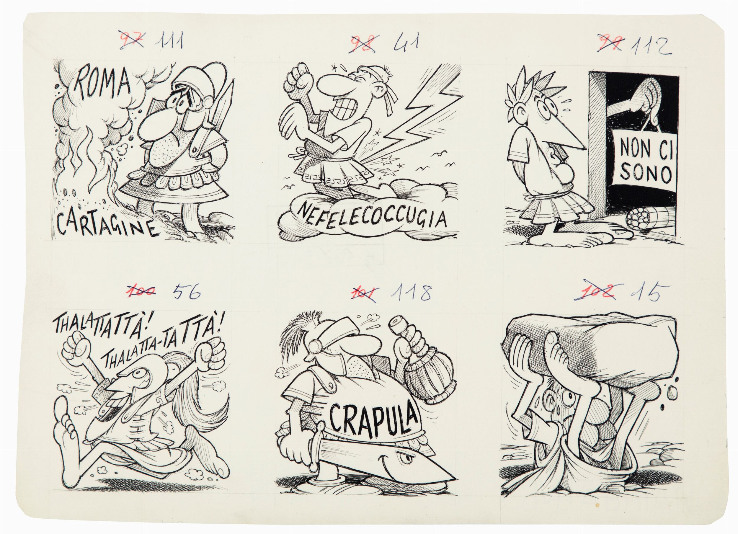 1964 Disegno originale realizzato da Jacovitti contenente 6 vignette originali pubblicate sulle pagine del Diario Vitt 1964/1965 dalle Edizioni AVE. Timbro editoriale al retro.