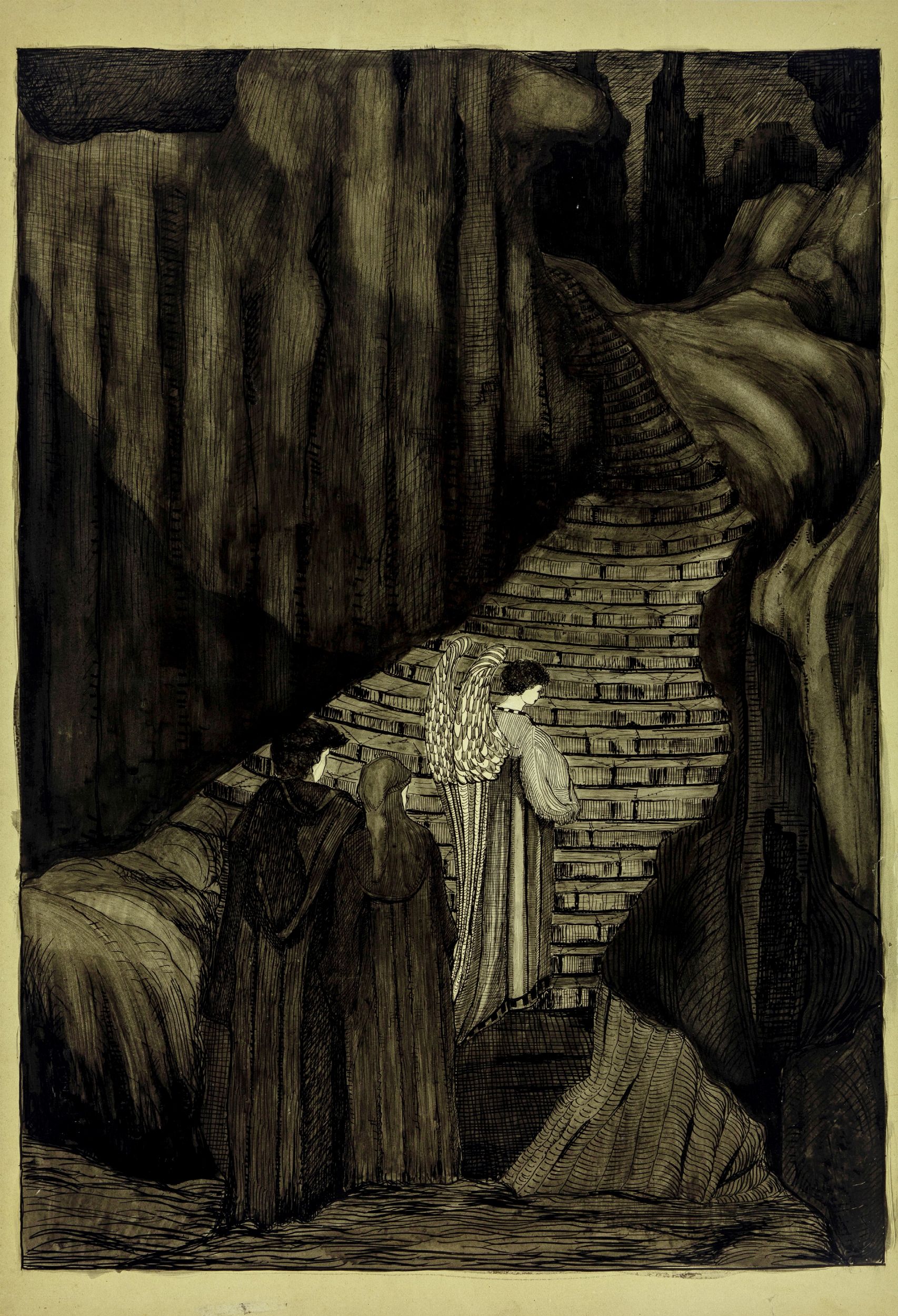 1907 Illustrazione originale realizzata da Manfredini tra il 1904 e il 1907 per la sua celebre edizione de 'La Divina Commedia' edita da Nerbini nel 1908. Alcuni strappi ai margini. Nato a Ferrara nel 1881, Manfredini si trasferì a Firenze nel 1904 anno in cui l'editore Giuseppe Nerbini gli commissionò una nuova edizione della Commedia chiedendogli di illustrare i cento canti del poema. Nel corso dell'esecuzione febbrile ed eccitata di questa faticosa opera, Manfredini si invaghì follemente della cantante lirica ucraina Solomija Krusel'nyc'ka, il suo amore non corrisposto lo portò alla follia e a diversi episodi violenti che sfociarono in numerosi arresti. Nell'aprile 1907 venne arrestato dopo essere stato trovato in possesso di una pistola e di un flacone di vetriolo (destinato probabilmente alla soprano ucraina), fu quindi ricoverato presso il manicomio di Mombello in Brianza dove, dopo un'agonia durata quaranta giorni, Manfredini morì ufficialmente per una grave forma di tubercolosi polmonare. La sua opera rimase incompiuta arrestandosi al XXX canto del Purgatorio, Nerbini decise quindi di affidare le restanti tavole al napoletano Tancredi Scarpelli.