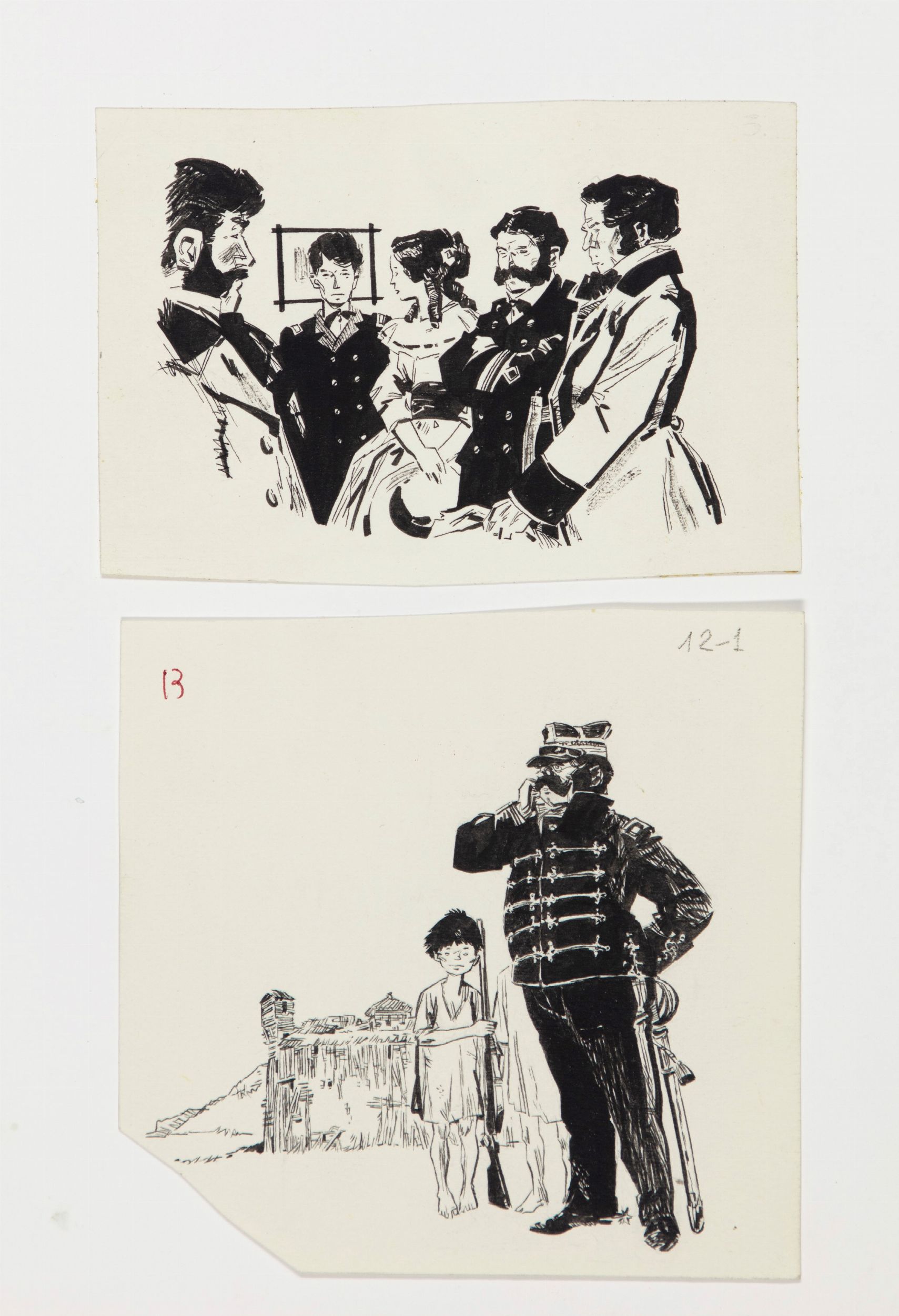 1958 Coppia di 2 vignette originali realizzate da Battaglia per la trasposizione a fumetti de 'I figli del capitano Grant' di Jules Verne, edite a puntate su Topolino nel 1958.