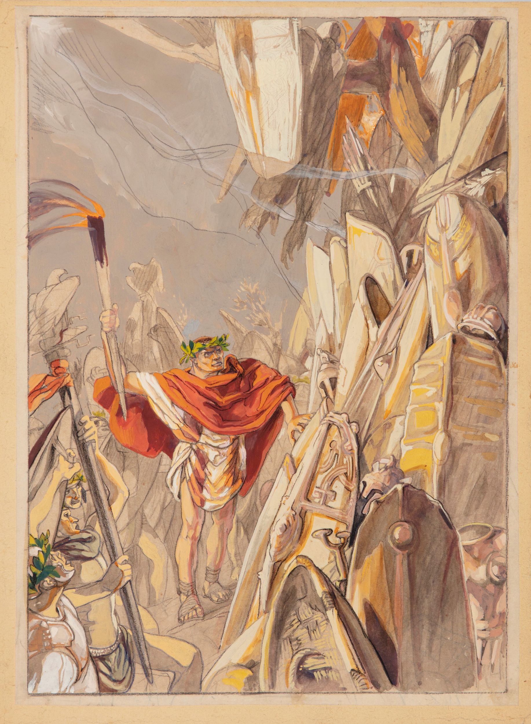 1936 Illustrazione originale realizzata da Cambellotti tra il 1936 e il 1938 per 'I grandi condottieri italiani', opera probabilmente rimasta inedita. Cambellotti si accostò inizialmente all‘Art Nouveau, accogliendone però gli aspetti prettamente originari e pionieristici espressi dalle idee di William Morris, per poi avvicinarsi al futurismo. Egli, come Morris, vide nell‘arte una finalità sociale, globale, moralistica, pedagogica al fine di renderla fruibile a tutti e, come l‘artista inglese, divenne l‘esempio lampante di artista-artigiano per eccellenza. Considerato uno degli esempi più fulgidi in Italia dell‘Art Nouveau, Cambellotti fu pittore, scultore, ceramista, scenografo, designer, architetto e incisore, ma è forse nell‘illustrazione che confluirono tutte le istanze artistiche alle quali si avvicinò nel corso della propria carriera. Opera archiviata nell‘Archivio Cambellotti con il n. 914.