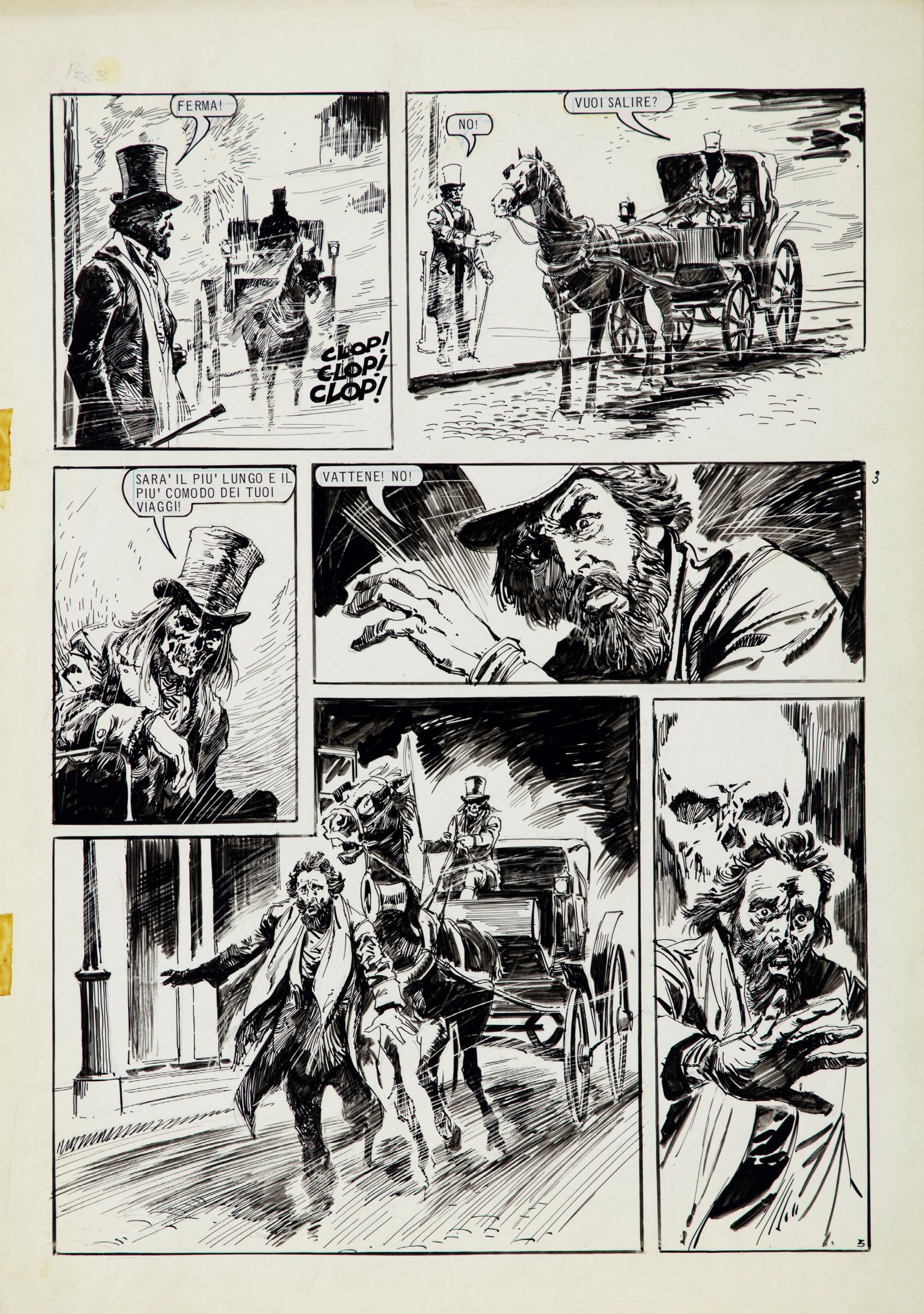 matita e china su cartoncino, 29,5 x 40,5 cm 1978 Tavola originale realizzata da Lalia per la storia intitolata 'I misteri di Londra' tav. 3, edita sulle pagine della rivista Lanciostory n. 25 del 1978. Opera recentemente pubblicata sul volume 'I misteri di Londra: Tredici indagini dell'ispettore Bull' dalla 001 Edizioni nel 2017. Lieve piega all'angolo superiore sinistro.