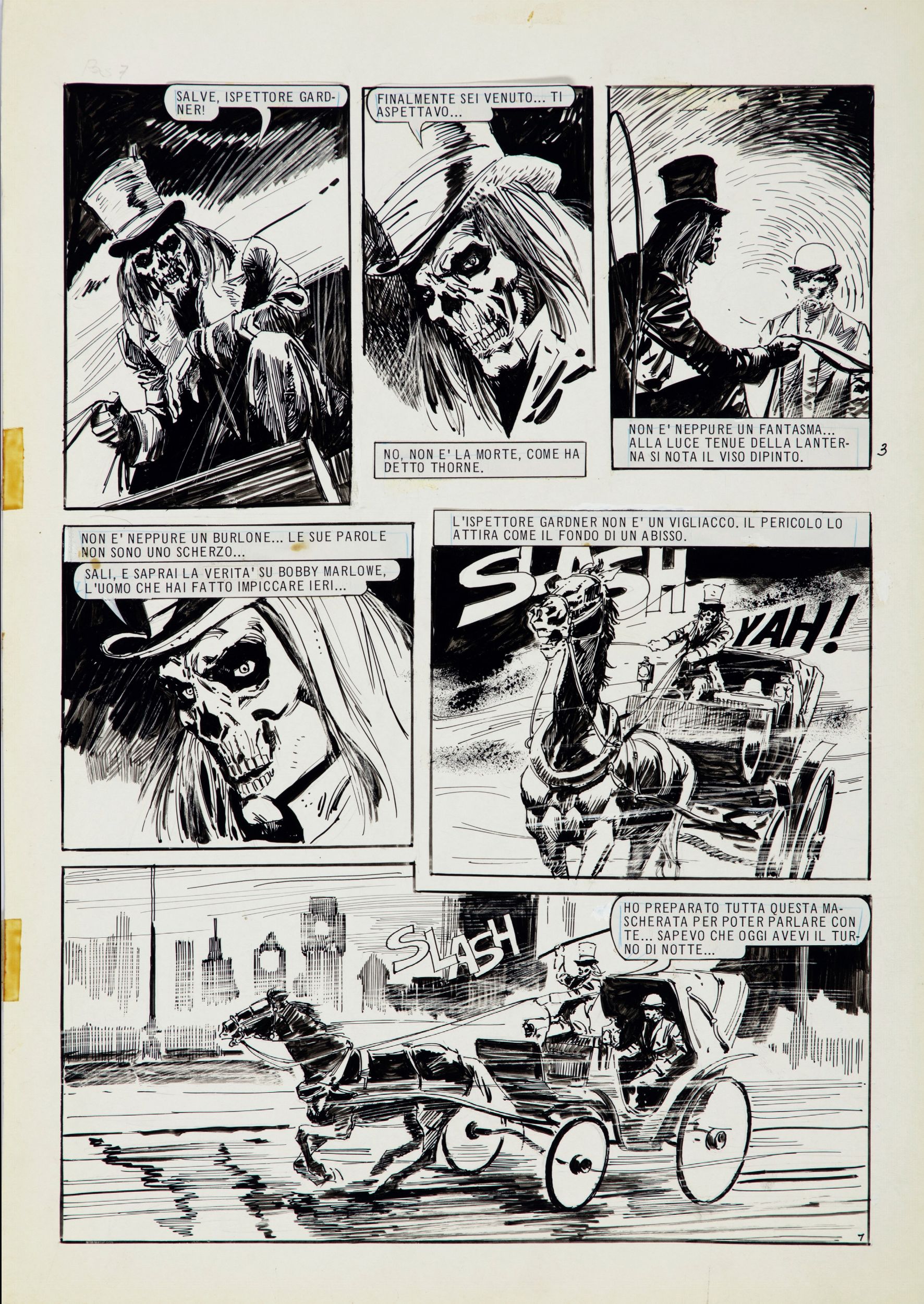 matita e china su cartoncino, 29,5 x 40,5 cm 1978 Tavola originale realizzata da Lalia per la storia intitolata 'I misteri di Londra' tav. 7, edita sulle pagine della rivista Lanciostory n. 25 del 1978. Opera recentemente pubblicata sul volume 'I misteri di Londra: Tredici indagini dell'ispettore Bull' dalla 001 Edizioni nel 2017. Lieve piega all'angolo superiore sinistro.