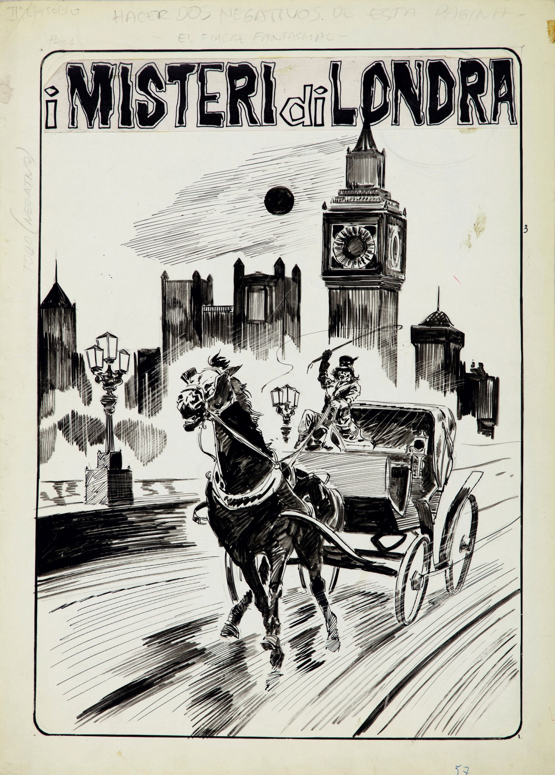 matita e china su cartoncino, 29,5 x 40,5 cm 1978 Title page originale realizzata da Lalia per la storia intitolata 'I misteri di Londra', edita sulle pagine della rivista Lanciostory n. 25 del 1978. Opera recentemente pubblicata sul volume 'I misteri di Londra: Tredici indagini dell'ispettore Bull' dalla 001 Edizioni nel 2017. Lieve piega all'angolo superiore sinistro.