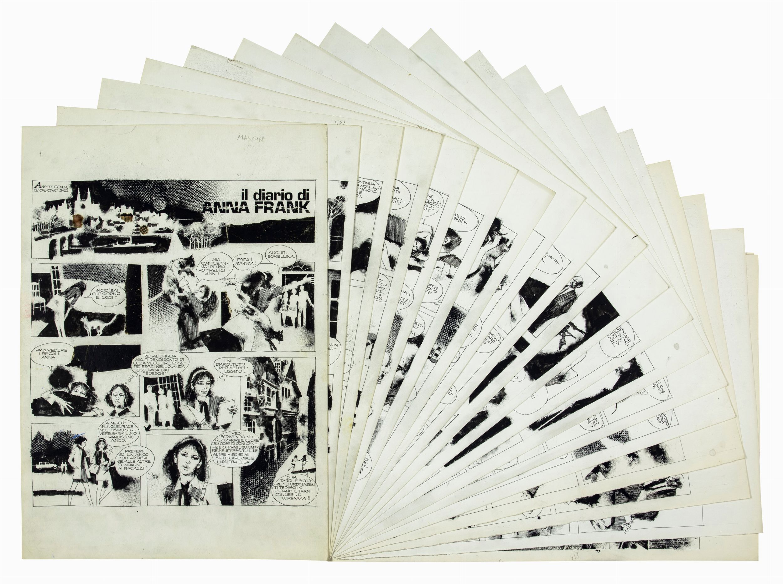 matita e china su cartoncino, 35,5 x 50 cm ciascuno 1977 Storia completa composta da 25 tavole originali e dalla copertina (70 x 50 cm) realizzate da Mancini per 'Il diario di Anna Frank', edita per la prima volta sul Messaggero dei Ragazzi n. 35 del novembre 1977. Tra le tante riduzioni letterarie del celebre diario di Anna Frank, quella di Mancini è sicuramente tra le più toccanti e visivamente più efficaci. Firmata e datata in copertina e in ultima pagina.