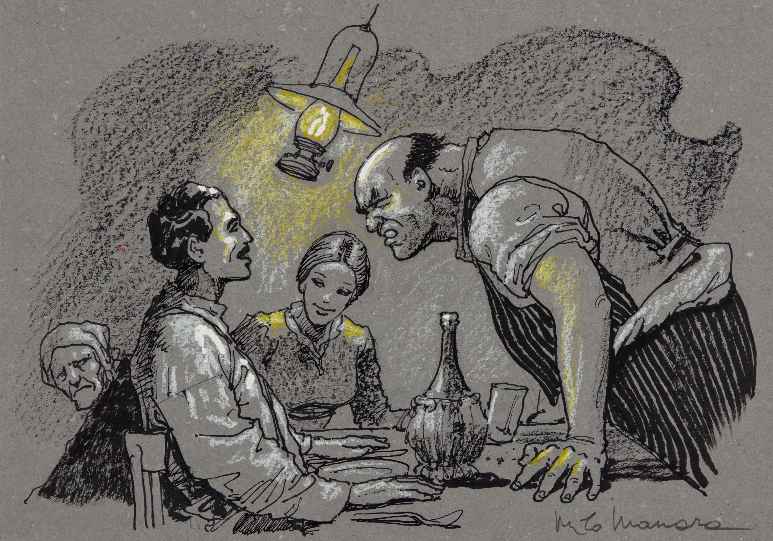 tecnica mista su carta grigia, 29,5 x 21 cm 2011 Illustrazione originale realizzata da Manara per il romanzo 'Il trombettiere' di David Riondino, edito da Magazzini Salani nel 2011. La storia di Giovanni Martini è il racconto di un viaggio, o meglio di una fuga rocambolesca e favolosa che lo porta a unirsi a Garibaldi e ai Mille. Firmata.