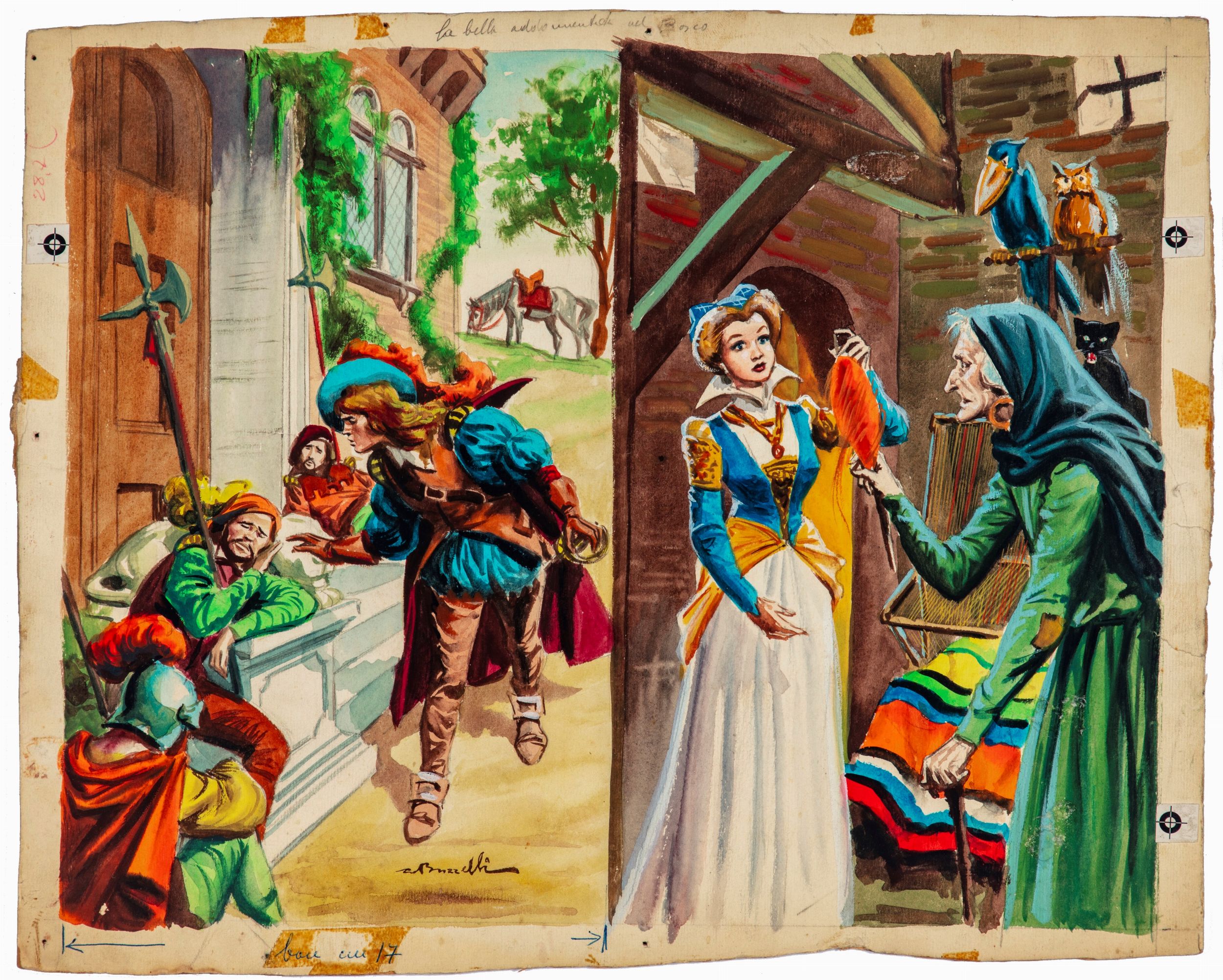 tempera su cartone, 38 x 30 cm 1955 Originale di copertina e quarta di copertina realizzato da Buzzelli per 'La bella addormentata nel bosco', edito su Bambola dalle Edizioni Diana nel 1955. Fori di affissione ai margini e piccolo strappo al margine destro. Firmato.