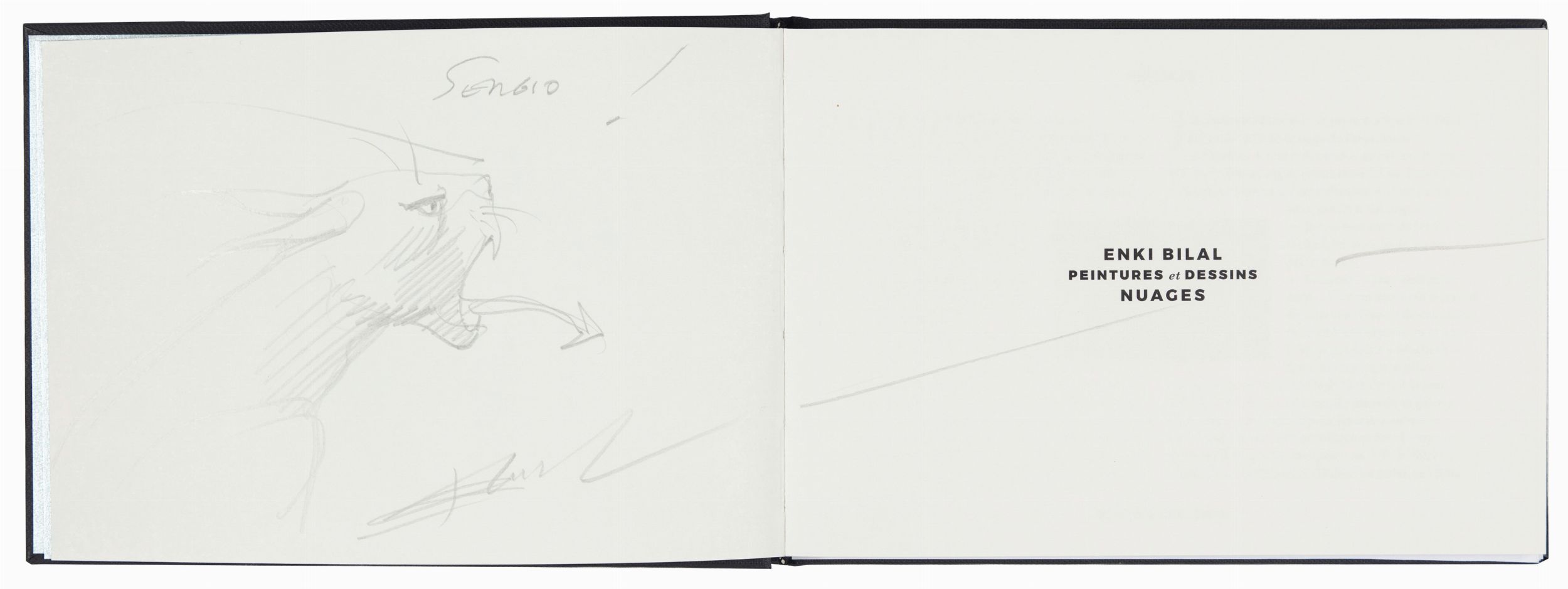 matita su carta, 42 x 14,5 cm 2017 Disegno originare realizzato da Bilal sul frontespizio del catalogo della mostra 'Enki Bilal: Peintures et Dessins', tenutasi presso la galleria Nuages di Milano nel 2017. Catalogo rilegato in tela nera e stampato in 150 esemplari numerati (nostro esemplare 19/150). Firmato e dedicato.