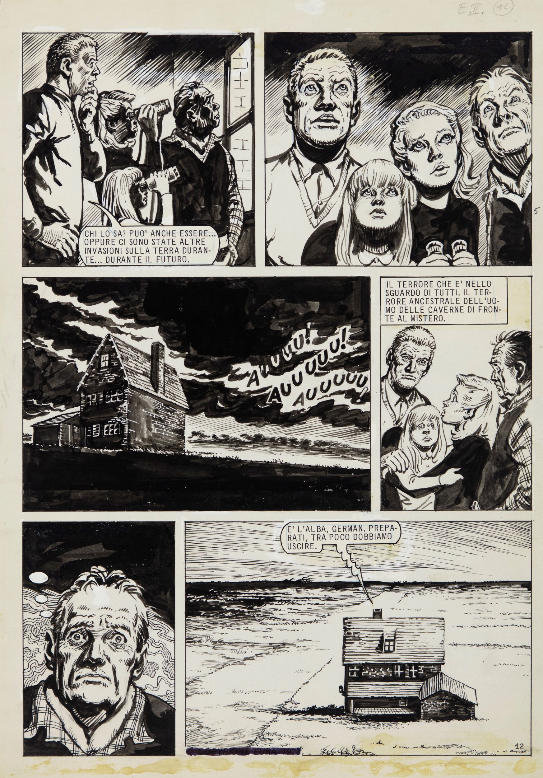 matita e china su cartoncino, 27,5 x 39 cm 1976 Tavola originale realizzata da Lopez per la seconda parte del suo capolavoro 'L'Eternauta', edita per la prima volta in Argentina su Skorpio dalle Edictiones Record nel 1976 e successivamente in Italia su Lanciostory nel 1978. Pag. 12 (episodio II) della saga creata da Héctor Oesterheld, divenuta una delle pietre miliari del fumetto moderno. Metafora e tragico anticipatore della situazione politica argentina che da li a poco sfocerà nella dittatura, L'Eternauta è divenuto un simbolo di rivolta civile e di indipendenza intellettuale, che costò la vita al suo autore quando nell'aprile del 1977 Oesterheld fu prelevato da uno Squadrone della Morte entrando così a far parte della numerosa schiera dei desaparecidos argentini. Lievi pieghe e piccoli strappi ai margini.