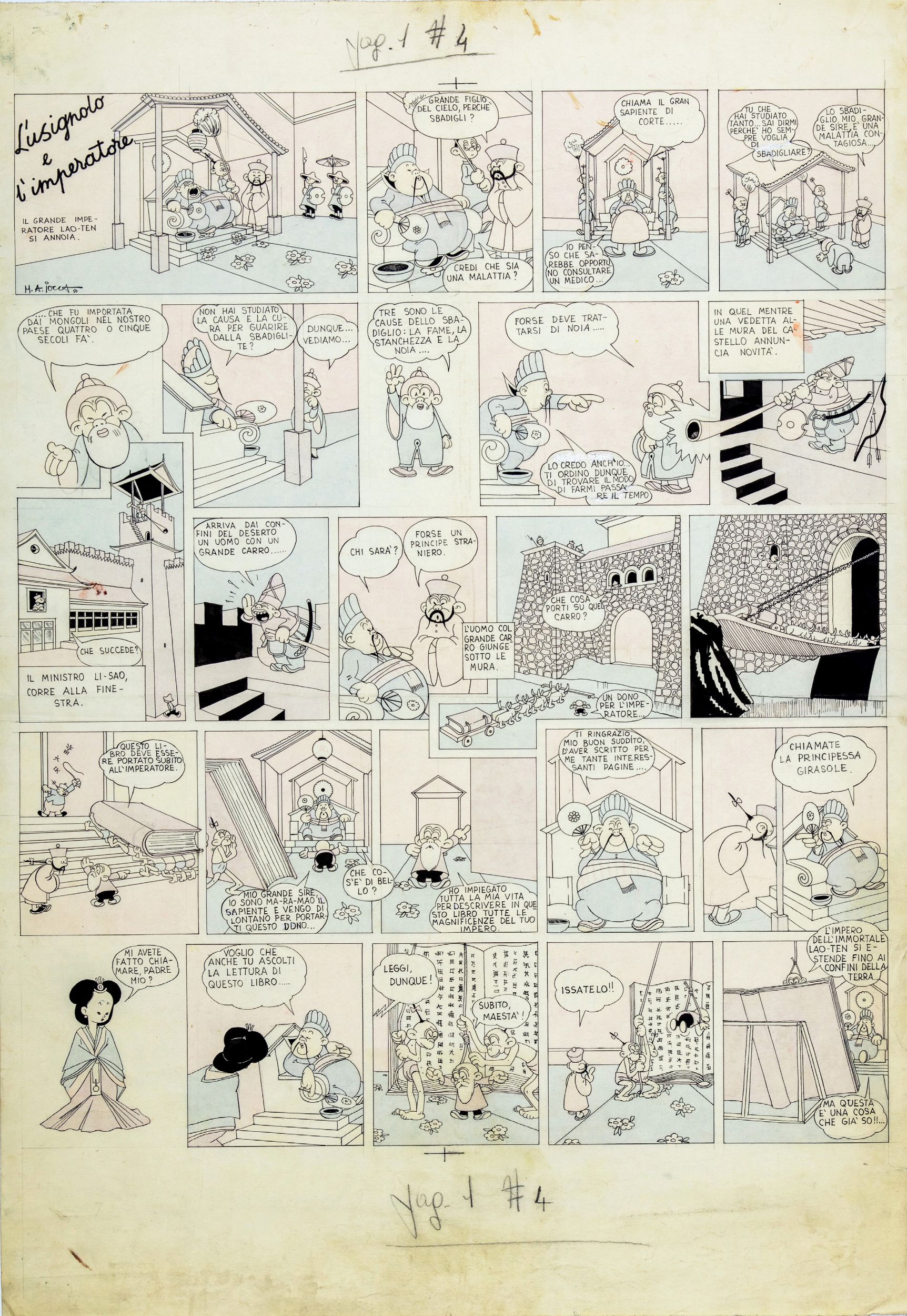 matita e china su cartoncino, 44 x 63,5 cm 1950 Tavola originale realizzata da Iocca per la pag. 1 de 'L'usignolo e l'imperatore' del 1950. Iocca è celebre per essere stato l'autore della segnaletica del Codice della strada italiano. Acquerellata al retro. Firmata e datata.