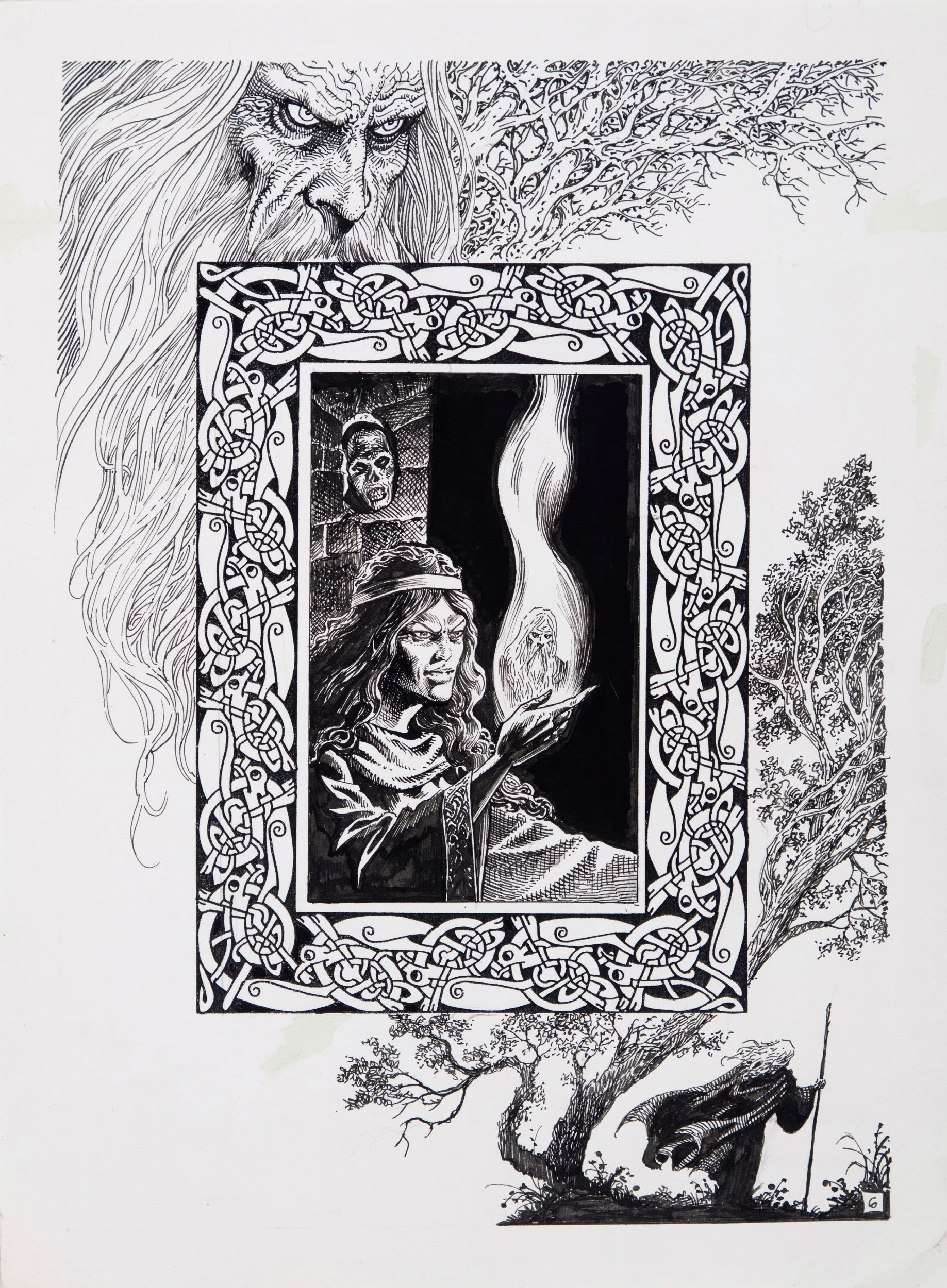 1994 Tavola originale realizzata da Alcatena per il suo capolavoro 'Merlino', pubblicata a dalla Eura Editoriale nel 1994. Testi di Robin Wood. Lieve piega all'angolo inferiore destro.
