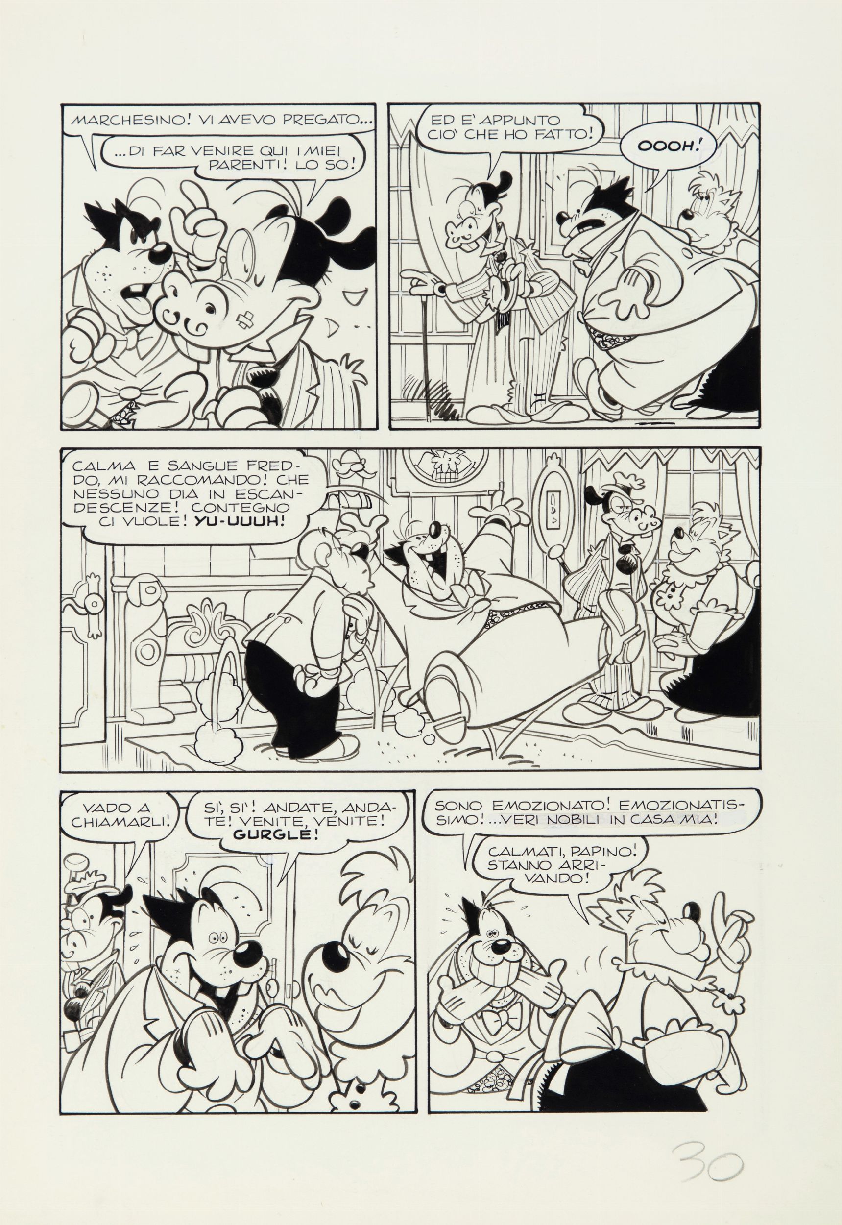matita e china su cartoncino, 25,5 x 36,5 cm 1993 Tavola originale realizzata da Cavazzano per 'Il Teatro Alambrah presenta: Miseria e nobiltà di Eduardo Scarpetta', edita su Topolino n. 1955 a pag. 30 nel Maggio 1993. Una storia già entrata nella leggenda come una delle migliori parodie Disney di sempre, sui testi di Francesco Artibani e dell‘attore Lello Arena.