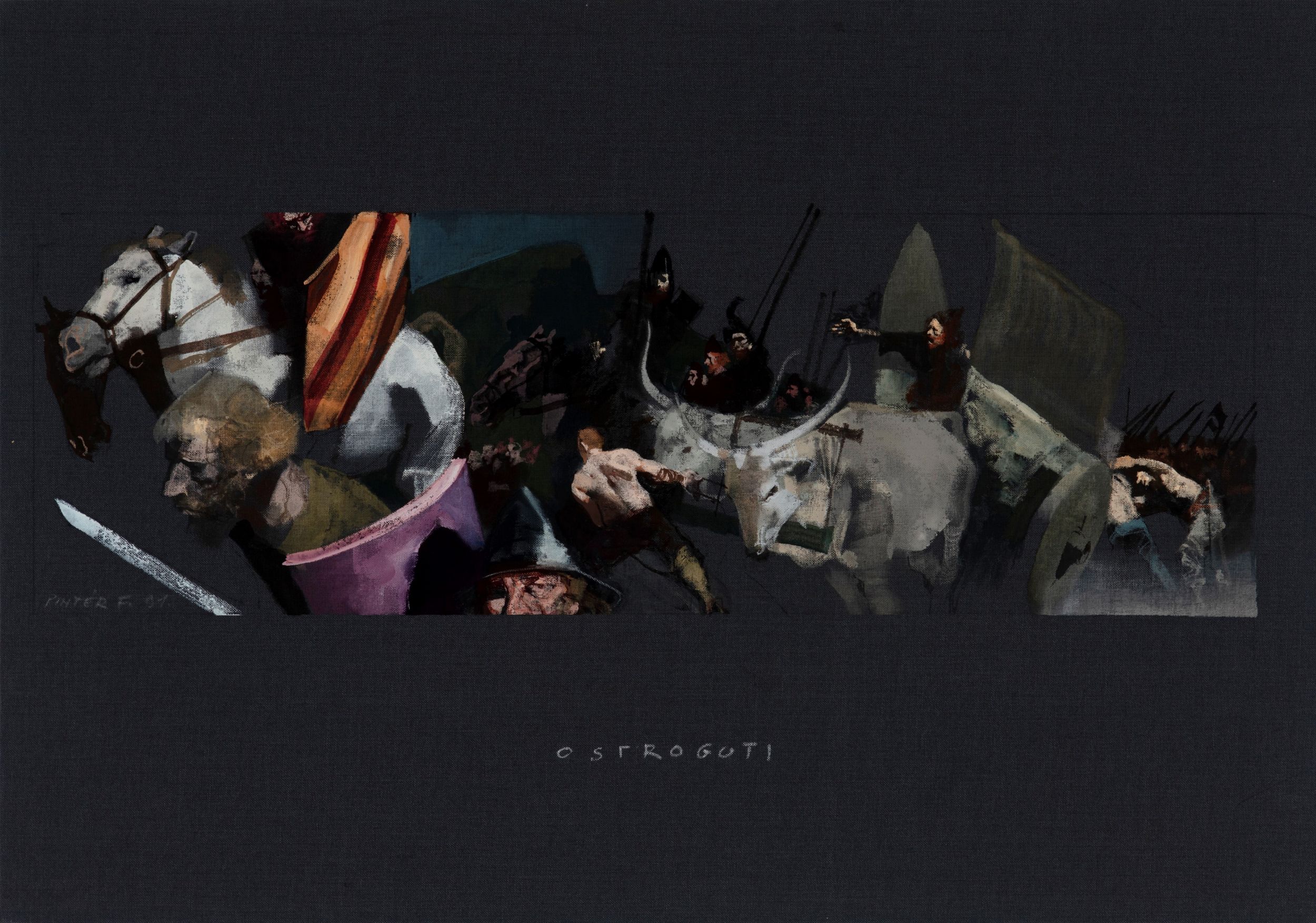 tempera su catone telato, 49,5 x 35 cm 1991 Illustrazione originale realizzata da Pintér nel 1991 per il Museo del Castello di Bellinzona in occasione della mostra 'La storia di Bellinzona nelle varie epoche'. Opera recentemente pubblicata sul volume 'Pintér inedito' edito da Lo Scarabeo nel 2014. Tra le voci più complesse e creative della grafica del XX secolo, Pintér con le sue illustrazioni ha lasciato un segno a livello mondiale, la sua opera è caratterizzata dall'impostazione grafico-cartellonistica mitteleuropea, la sua espressività risente di una cultura pittorica e artistica profondissima, con citazioni e richiami talvolta espliciti, talvolta sotterranei e incrociati. Firmata e datata.