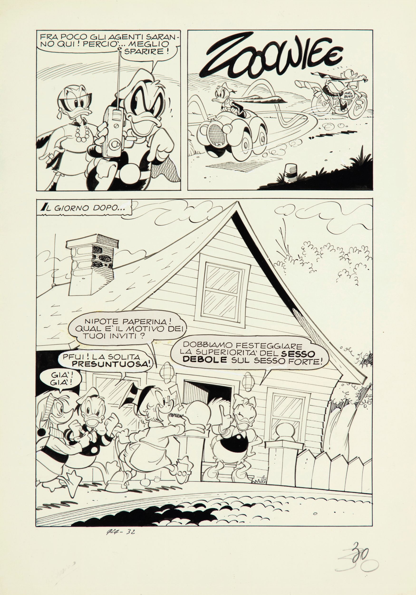 matita e china su cartoncino, 25,5 x 36 cm 1973 Tavola originale realizzata da Cavazzano per 'Paperinika contro Paperinik', edita su Topolino n. 924 a pag. 30 nell‘Agosto 1973. Paperinika è la controparte femminile di Paperinik; paladina del gentil sesso nonchè femminista sfegatata, che stanca della pretesa superiorità degli uomini e di Paperino in particolare, decide di creare la sua identità segreta da contrapporre a Paperinik. Di grande rarità.