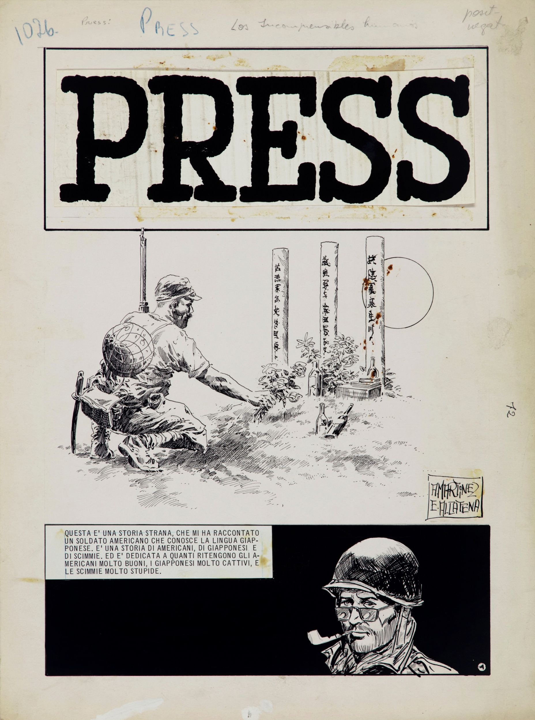 1978 Tavola originale realizzata da Alcatena per la pag. 1 di 'Los incomprensibles humanos', sesto capitolo della serie 'Press' edita su Lanciostory nel 1978. Lievi pieghe ai margini. Firmata.