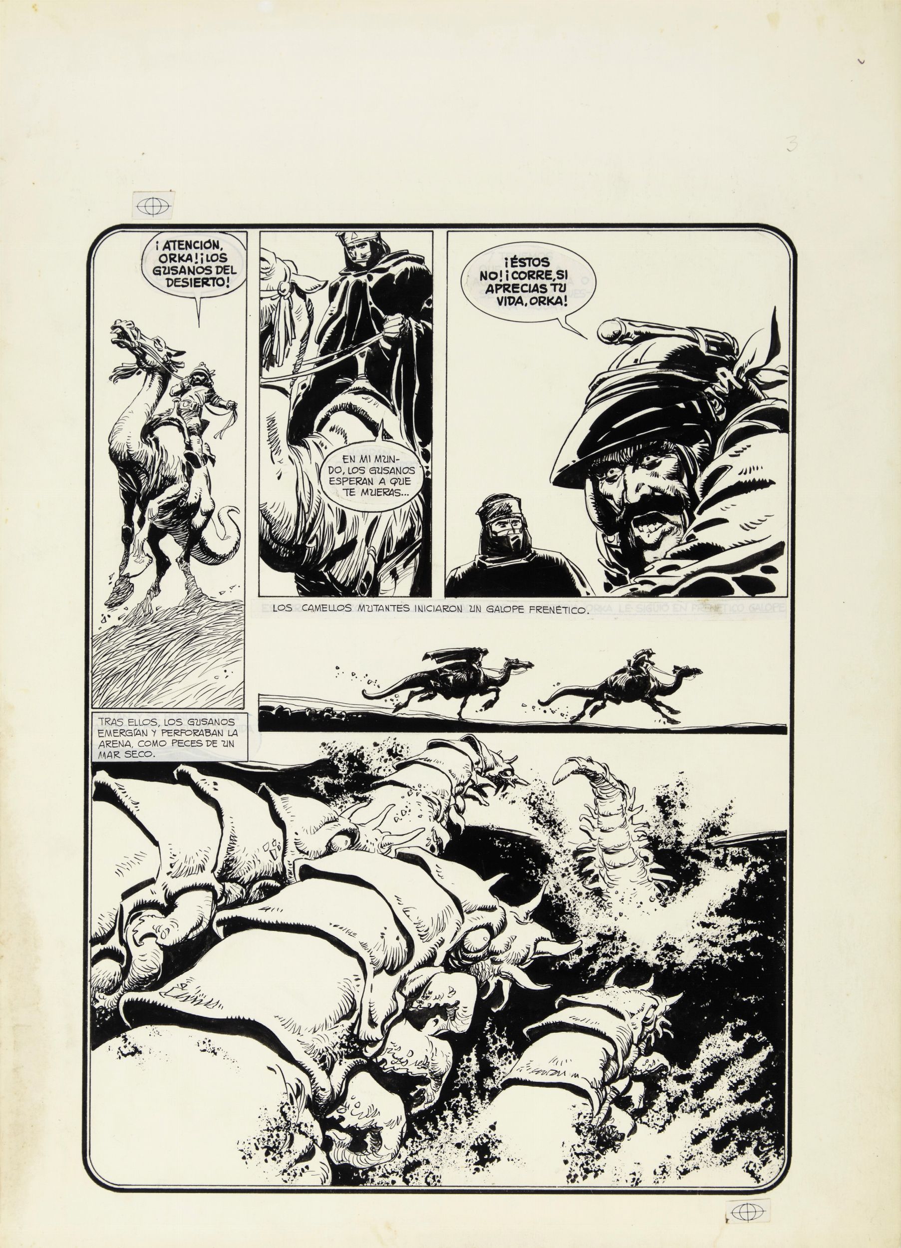 1981 Tavola originale realizzata da Bermejo per 'Pyramid of the Black Sun: Orka', edita per la prima volta su Eerie n. 124 a pag. 3 dalla Warren Publishing nel 1981. Tracce di umidità al margine sinistro.