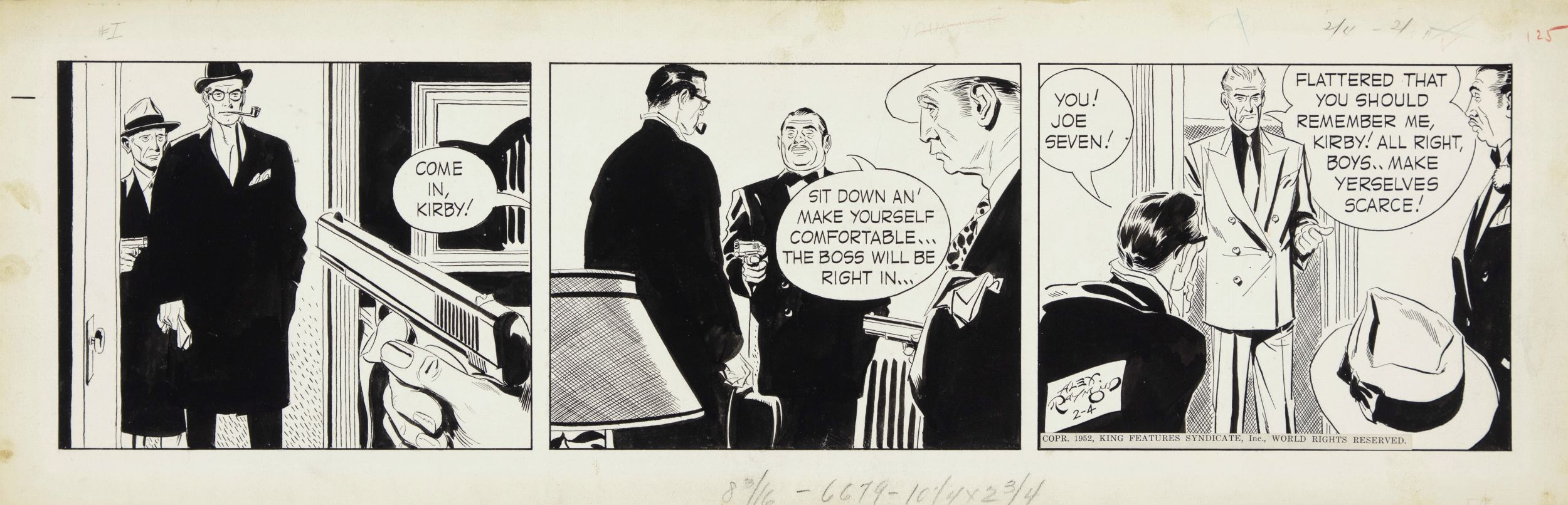 matita e china su cartoncino, 55 x 18 cm 1952 Striscia giornaliera del 04/02/1952 per 'Rip Kirby'. Il personaggio di Rip Kirby è forse il più autobiografico tra quelli creati da Alex Raymond, infatti, come lui, è un ex marine diventato detective privato, come Raymond ama fumare la pipa ed è sempre molto elegante, raffinato e colto. Firmata e datata.