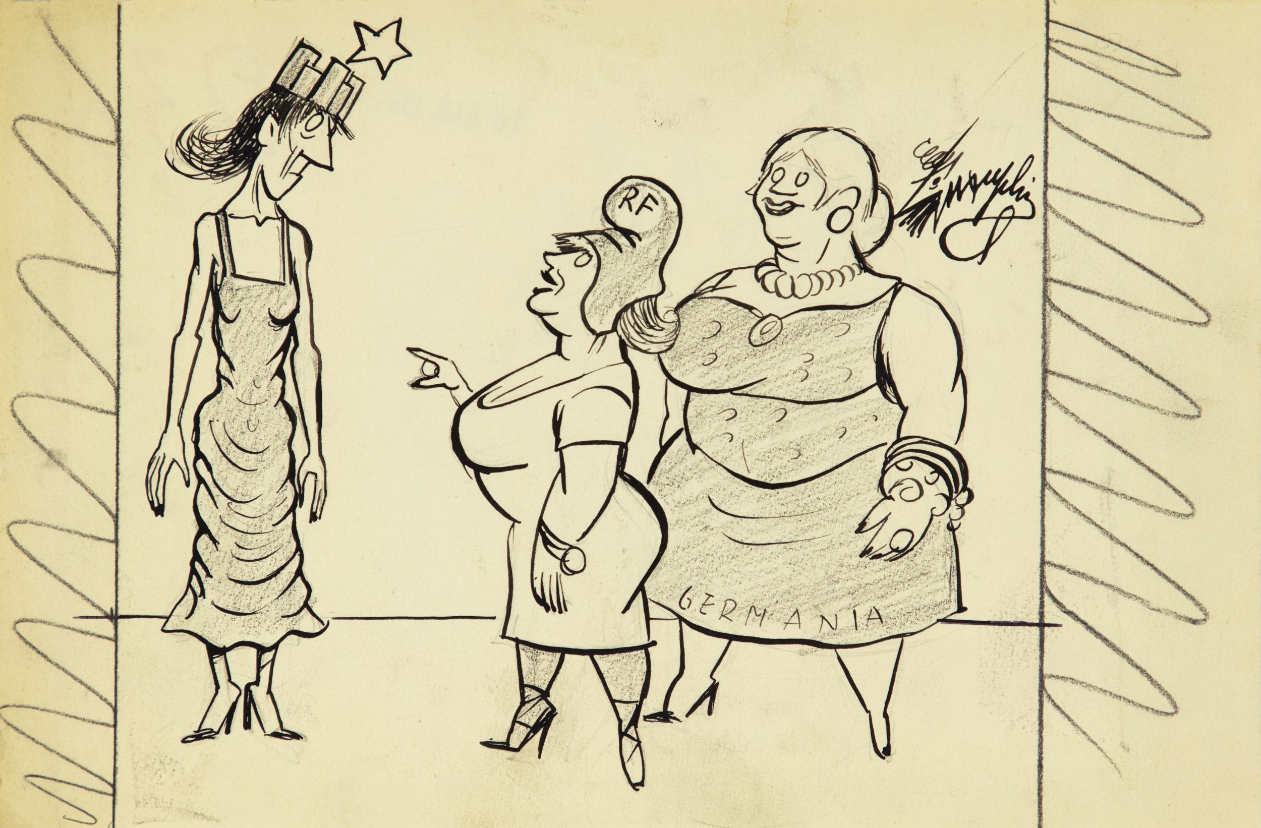 1964 Illustrazione originale realizzata da Guareschi e pubblicata sulle pagine del quotidiano La Notte il 3 Luglio 1964. > Firmata al fronte e datata al retro.